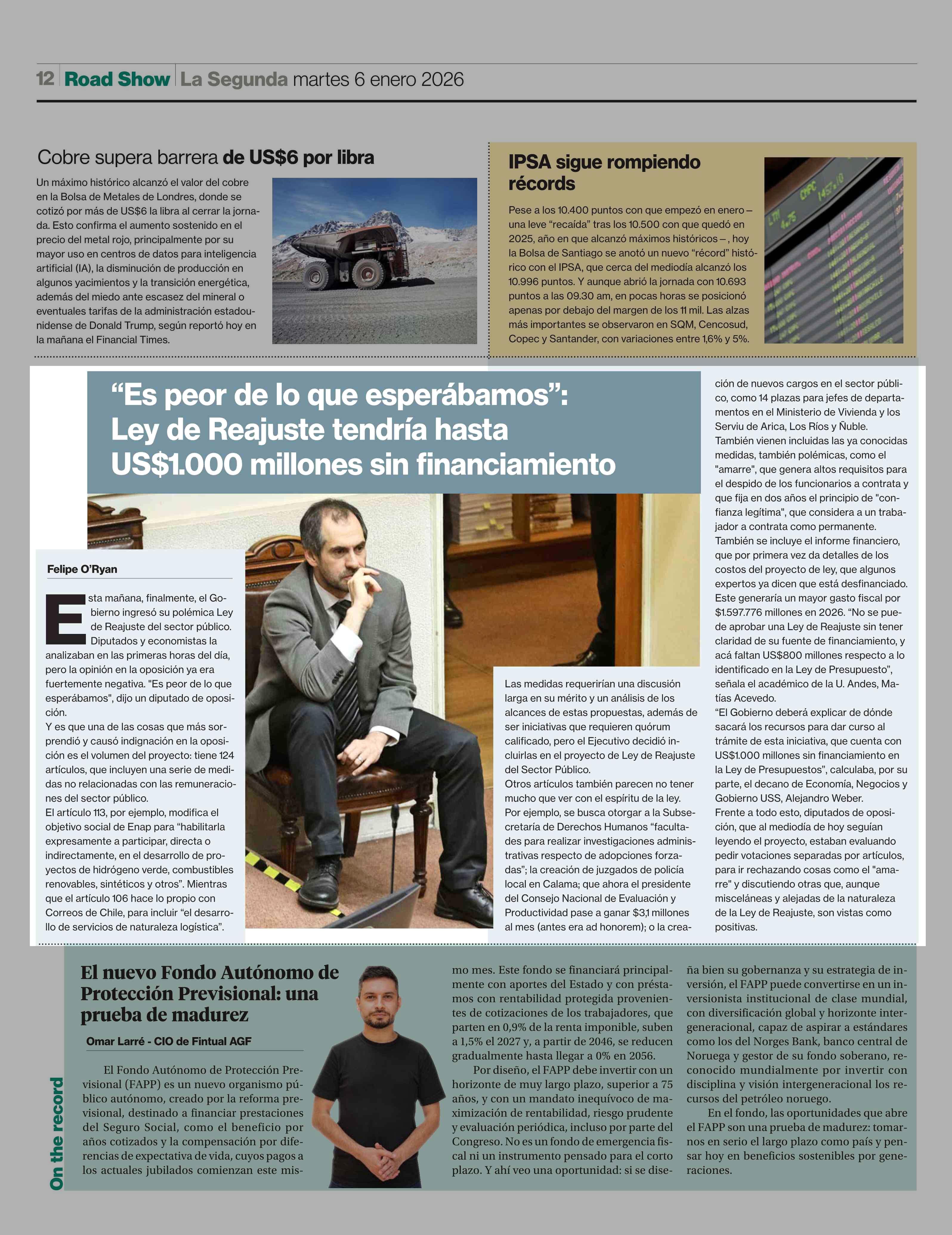 "Es peor de lo que esperábamos": Ley de Reajuste tendría hasta US$1.000 millones sin financiamiento 06-01-2026 La Segunda |