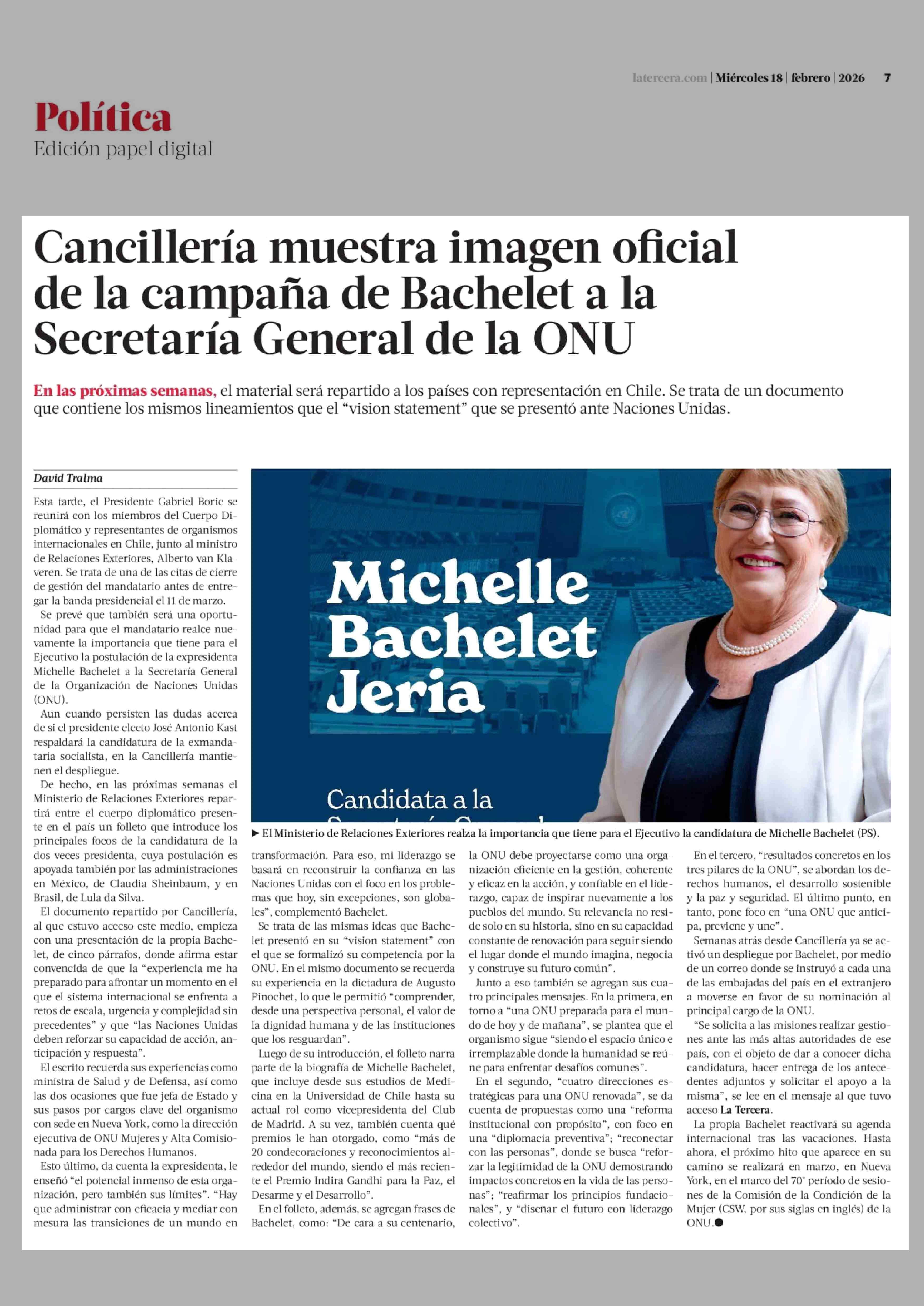 Cancillería muestra imagen oficial de la campaña de Bachelet a la Secretaría General de la ONU