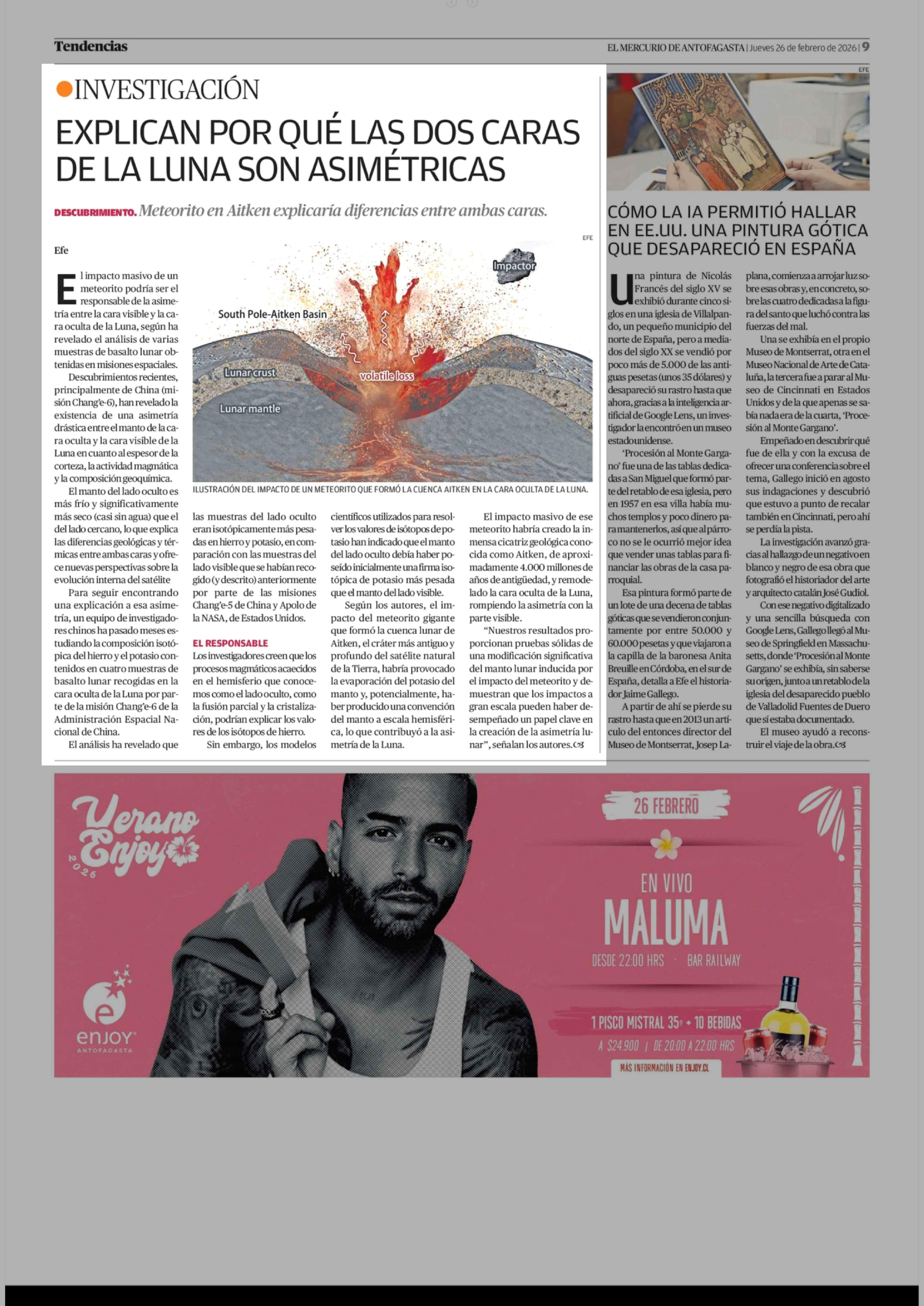 EXPLICAN POR QUÉ LAS DOS CARAS DE LA LUNA SON ASIMÉTRICAS 26-02-2026 El Mercurio de Antofagasta |