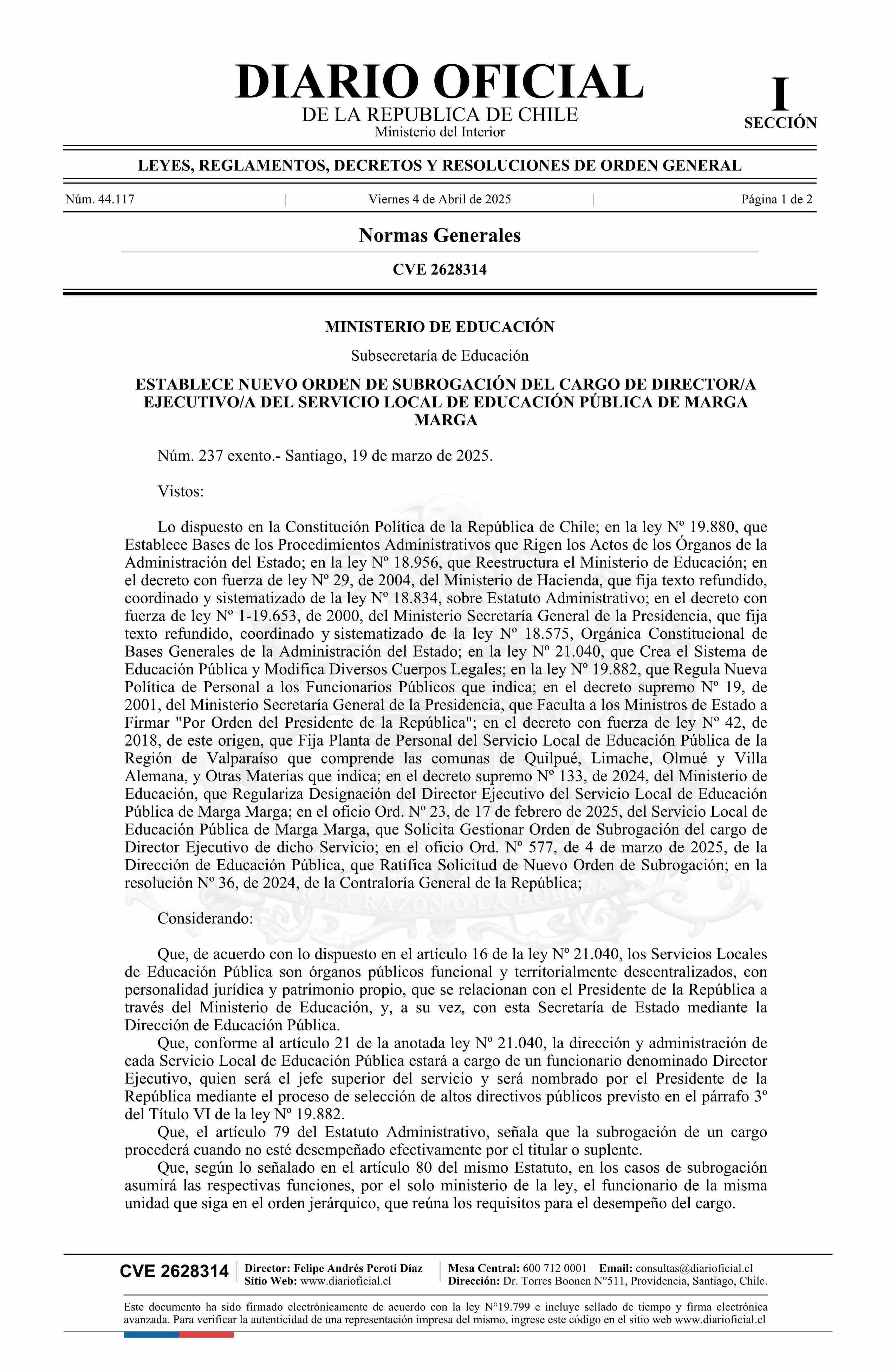Decreto exento número 237, de 2025.- Establece nuevo orden de subrogación del cargo de Director/a Ejecutivo/a del Servicio Local de Educación Pública de Marga Marga 04-04-2025 DIARIO OFICIAL CHILE - BOLETÍN OFICIAL DE MINERÍA |