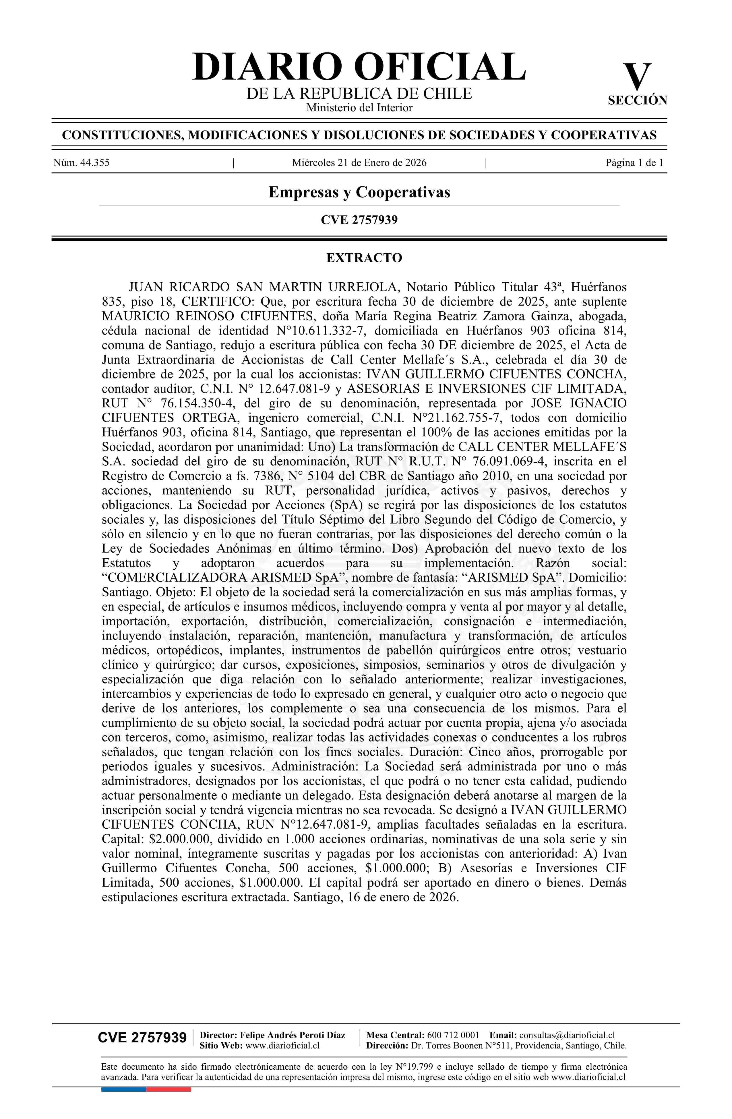 Título: CALL CENTER MELLAFE´S S.A. 76.091.069-4*