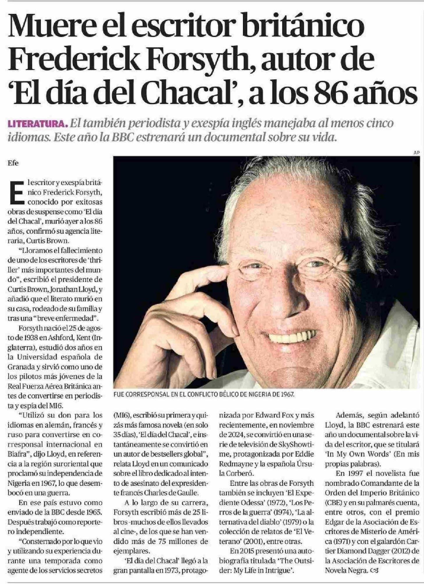 | Título: | Muere el escritor británico Frederick Forsyth, autor de “El día del Chacal” a los 86 años |
