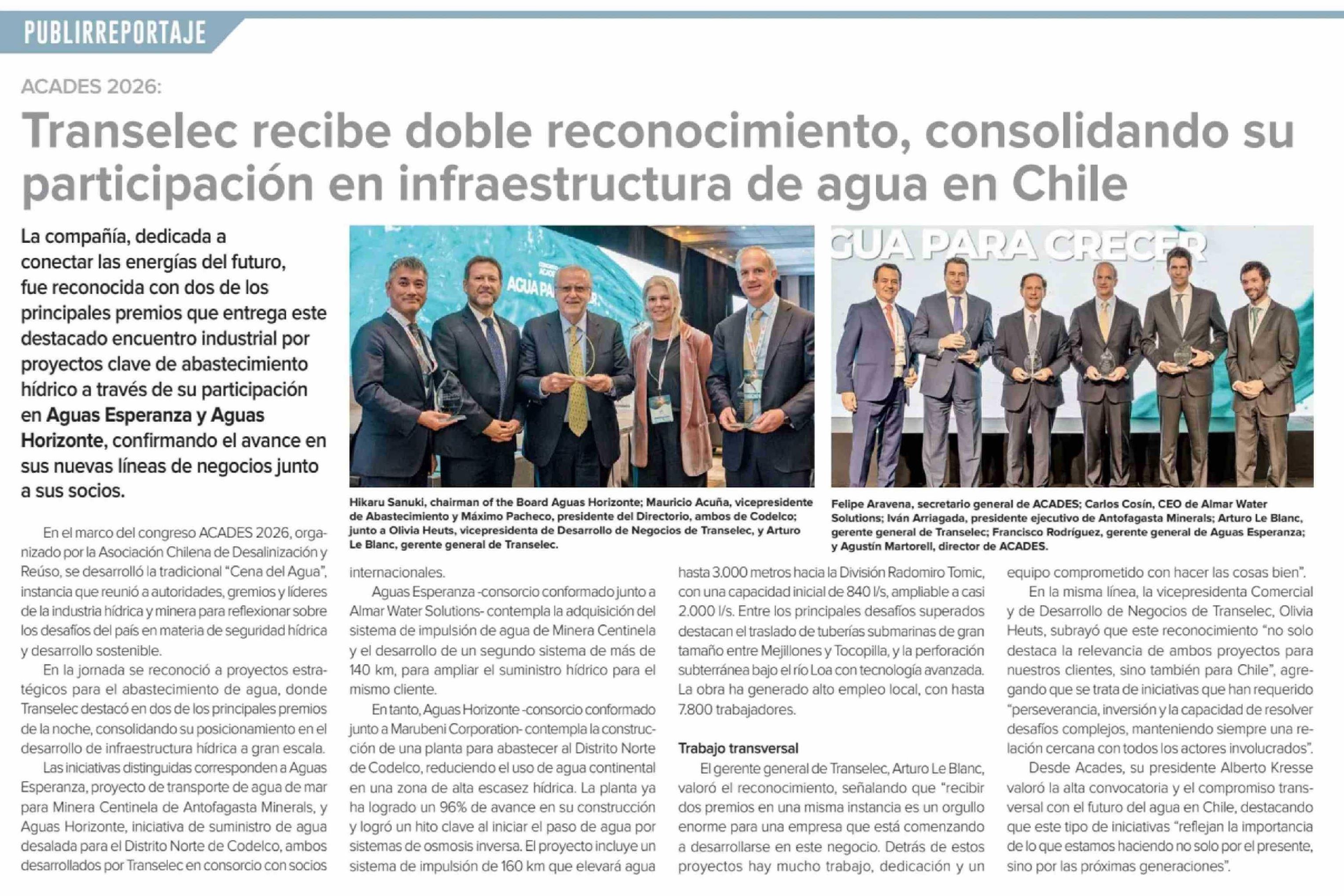 | Título: | Transelec recibe doble reconocimiento, consolidando su participación en infraestructura de agua en Chile |