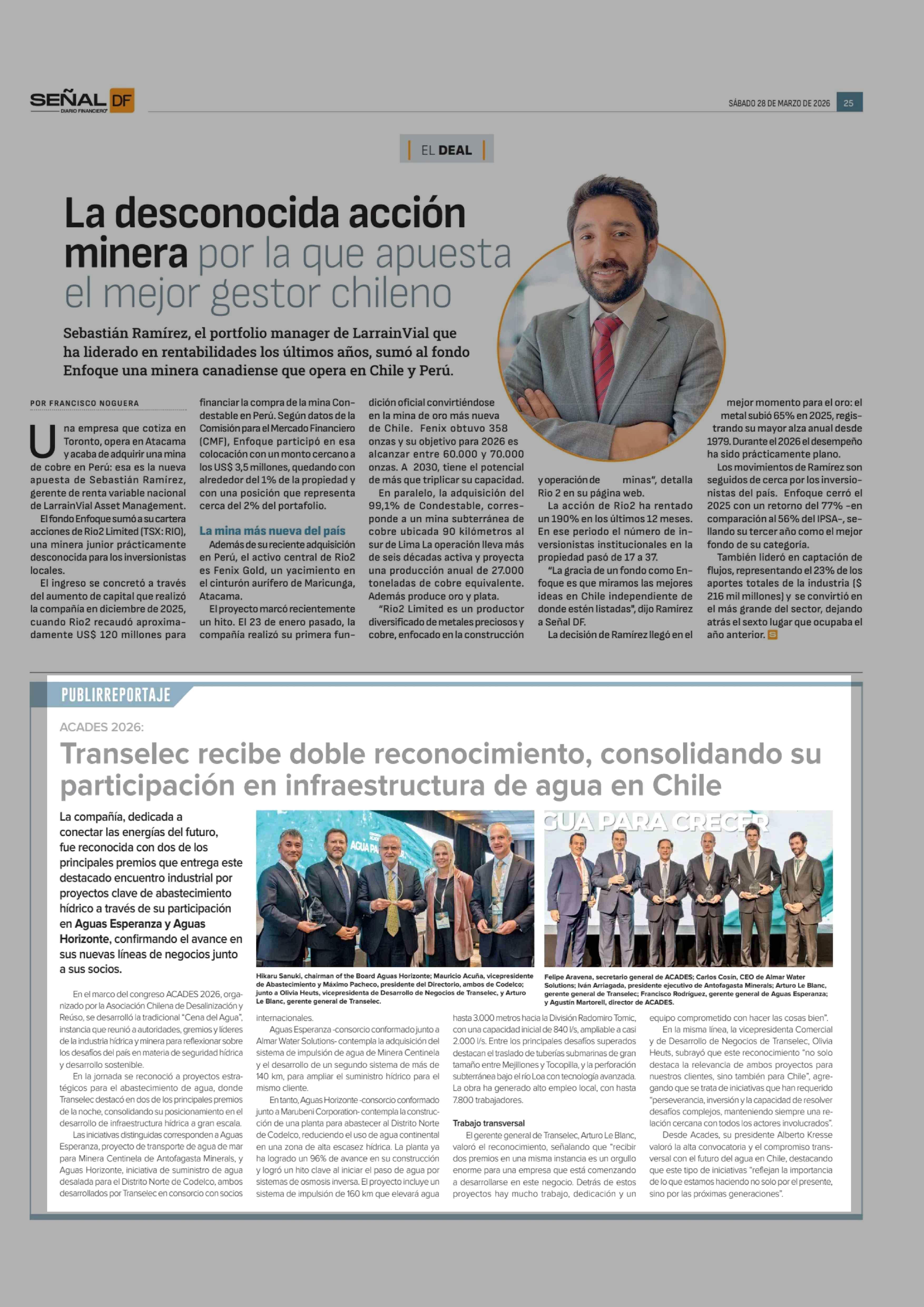Transelec recibe doble reconocimiento, consolidando su participación en infraestructura de agua en Chile 28-03-2026 Diario Financiero |