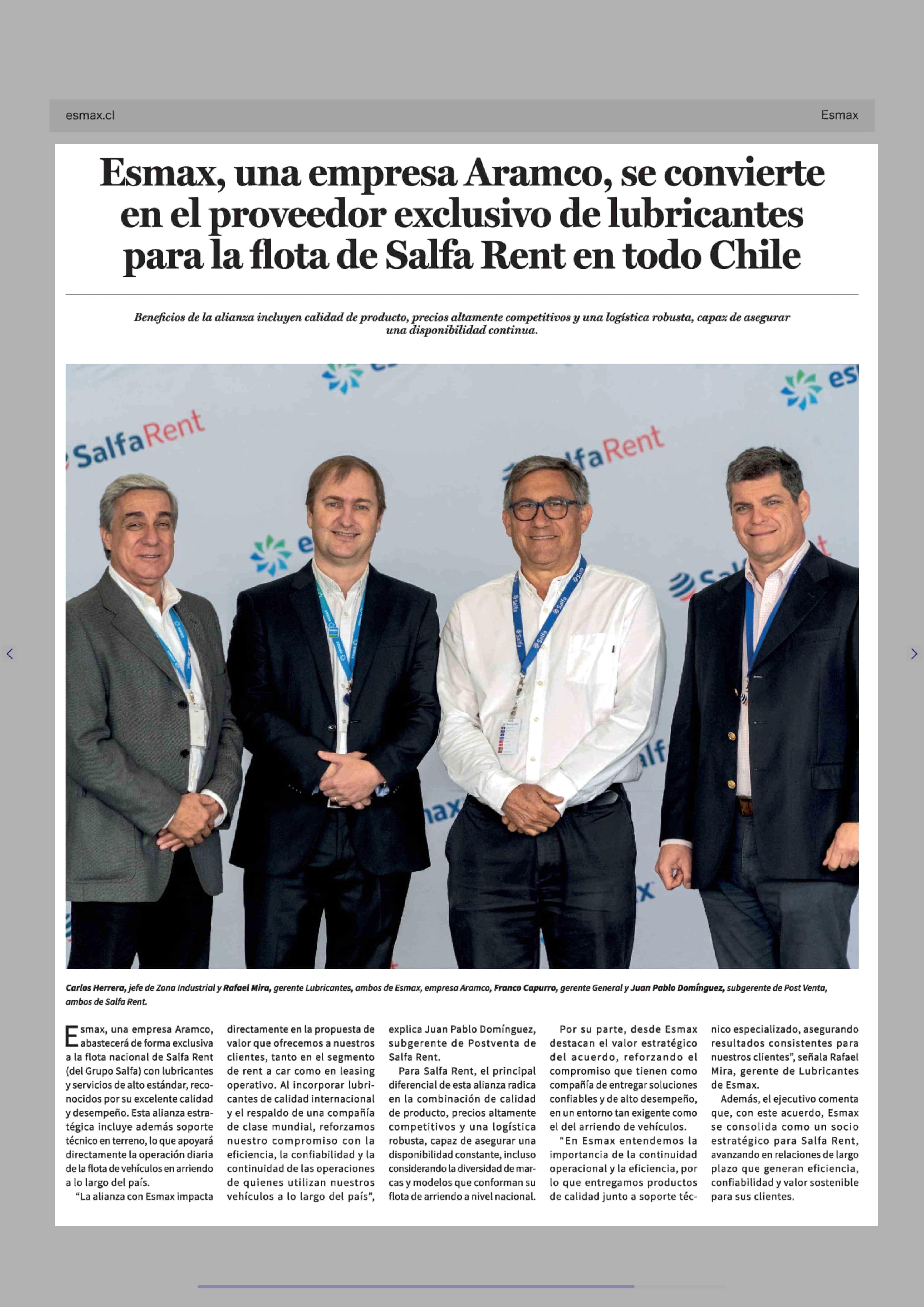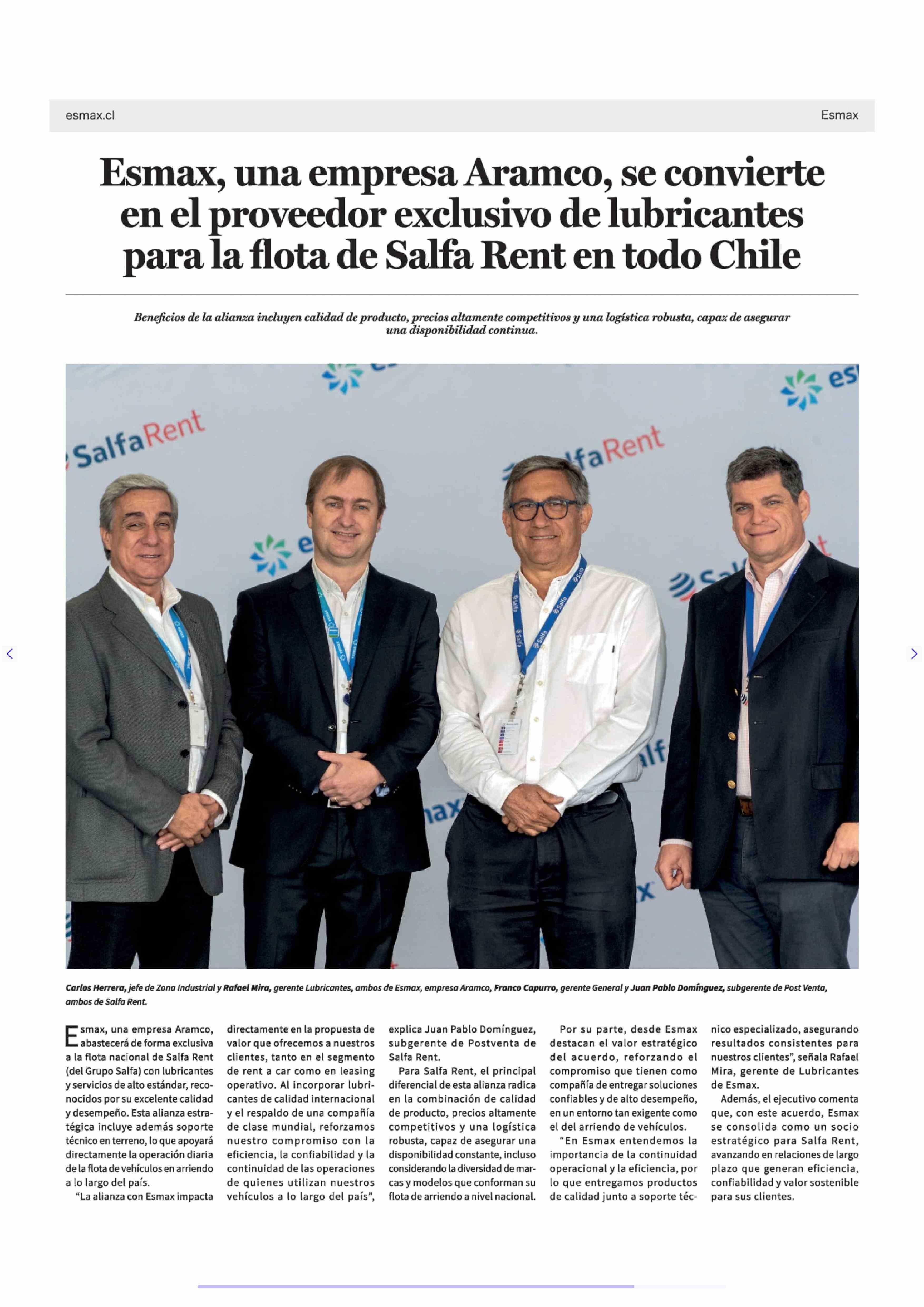 Esmax, una empresa Aramco, se convierte en el proveedor exclusivo de lubricantes para la flota de Salfa Rent en todo Chile