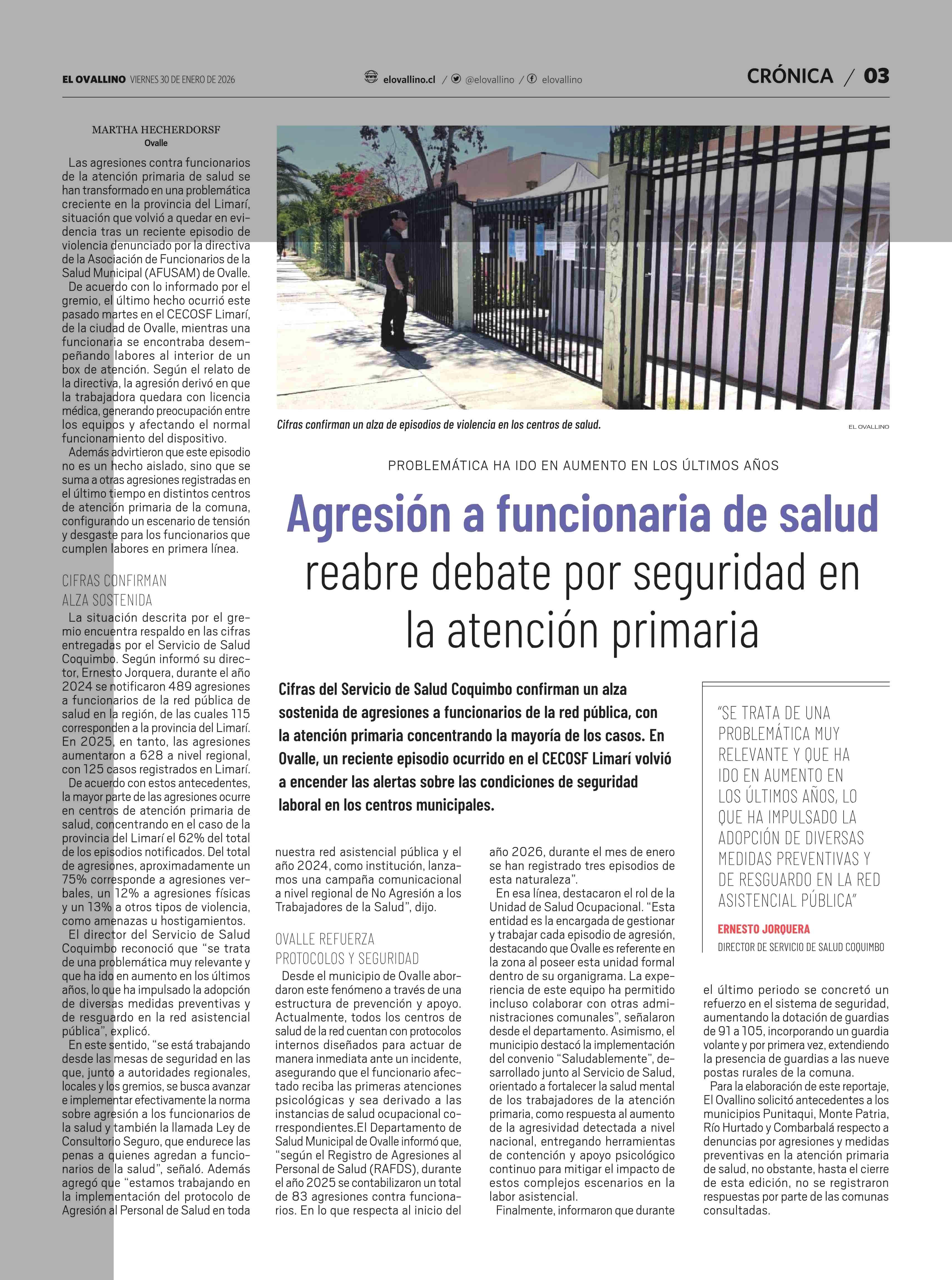 Agresión a funcionaria de salud reabre debate por seguridad en la atención primaria 30-01-2026 El Ovallino |