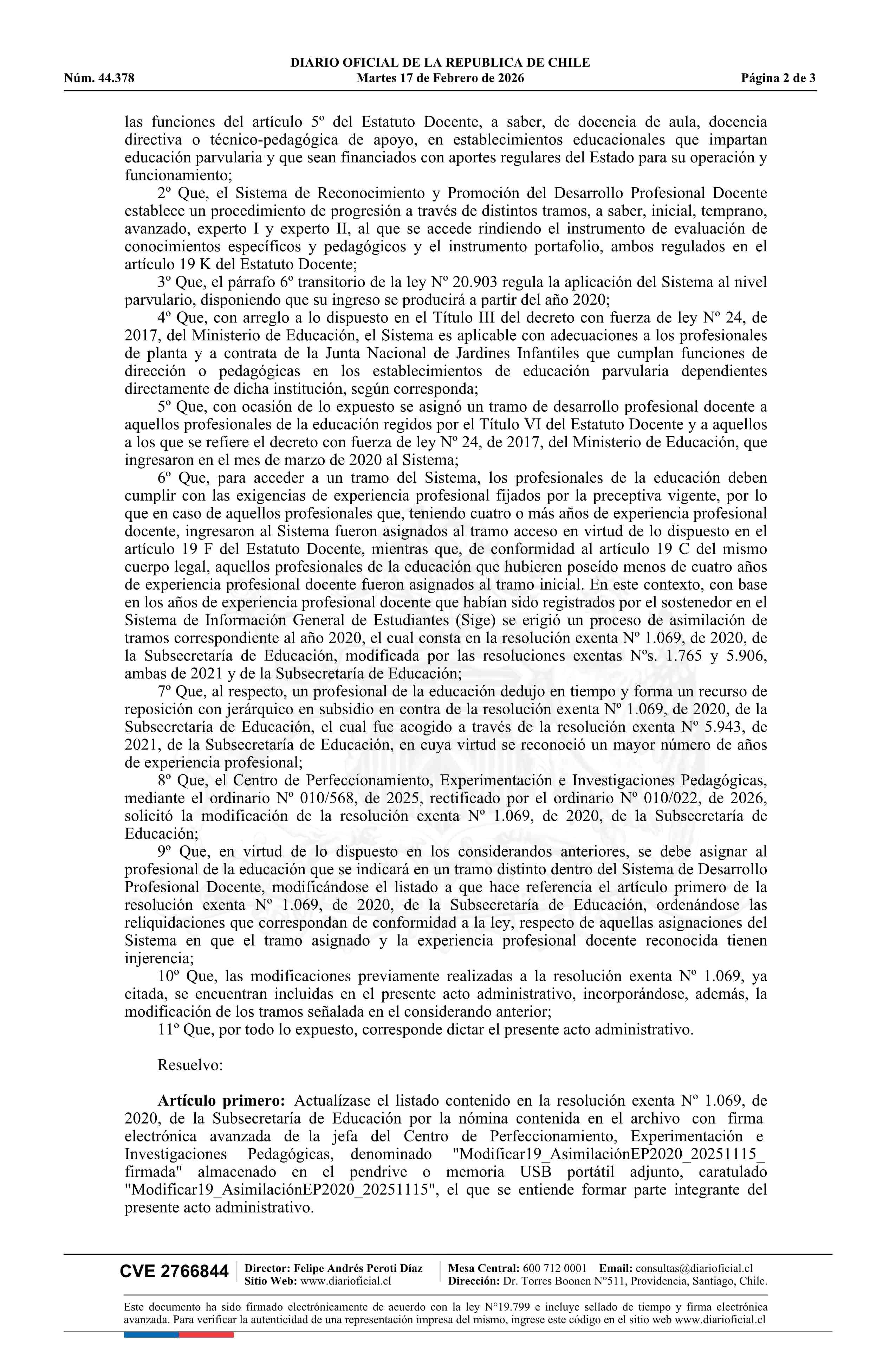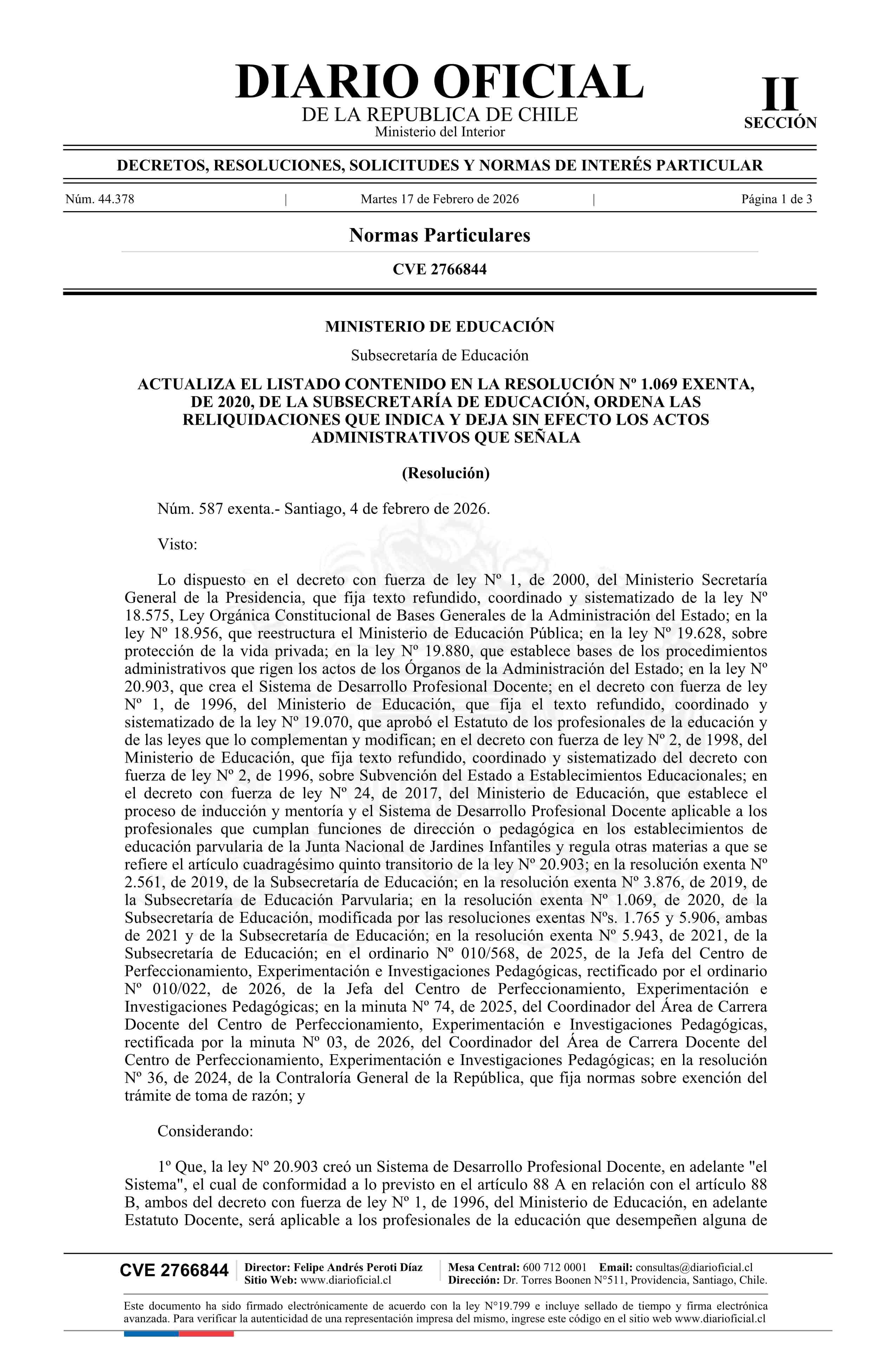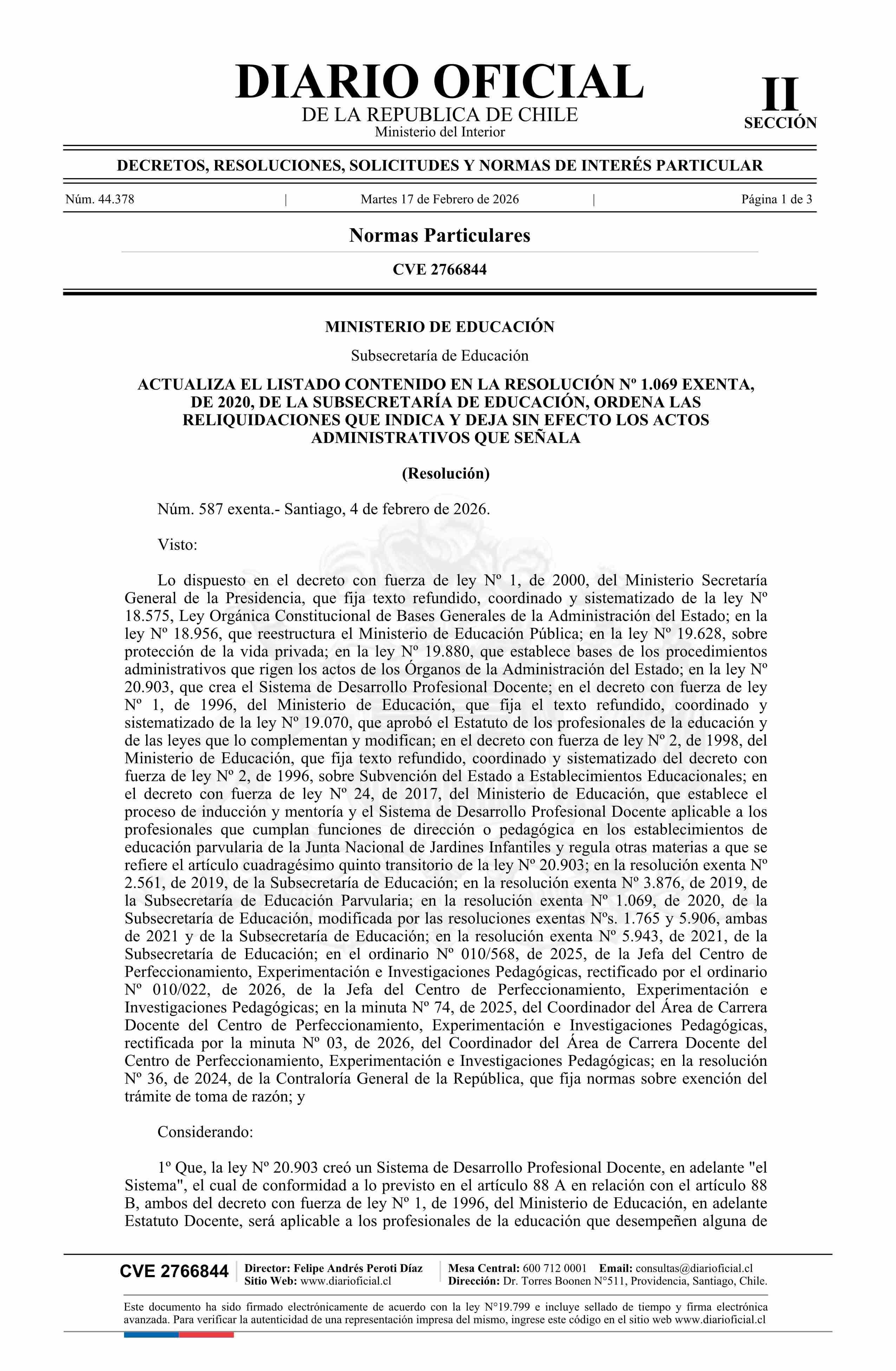 | Título: | Resolución exenta número 587, de 2026.- Actualiza el listado contenido en la resolución Nº 1.069 exenta, de 2020, ordena las reliquidaciones que indica y deja sin efecto los actos administrativos que señala |