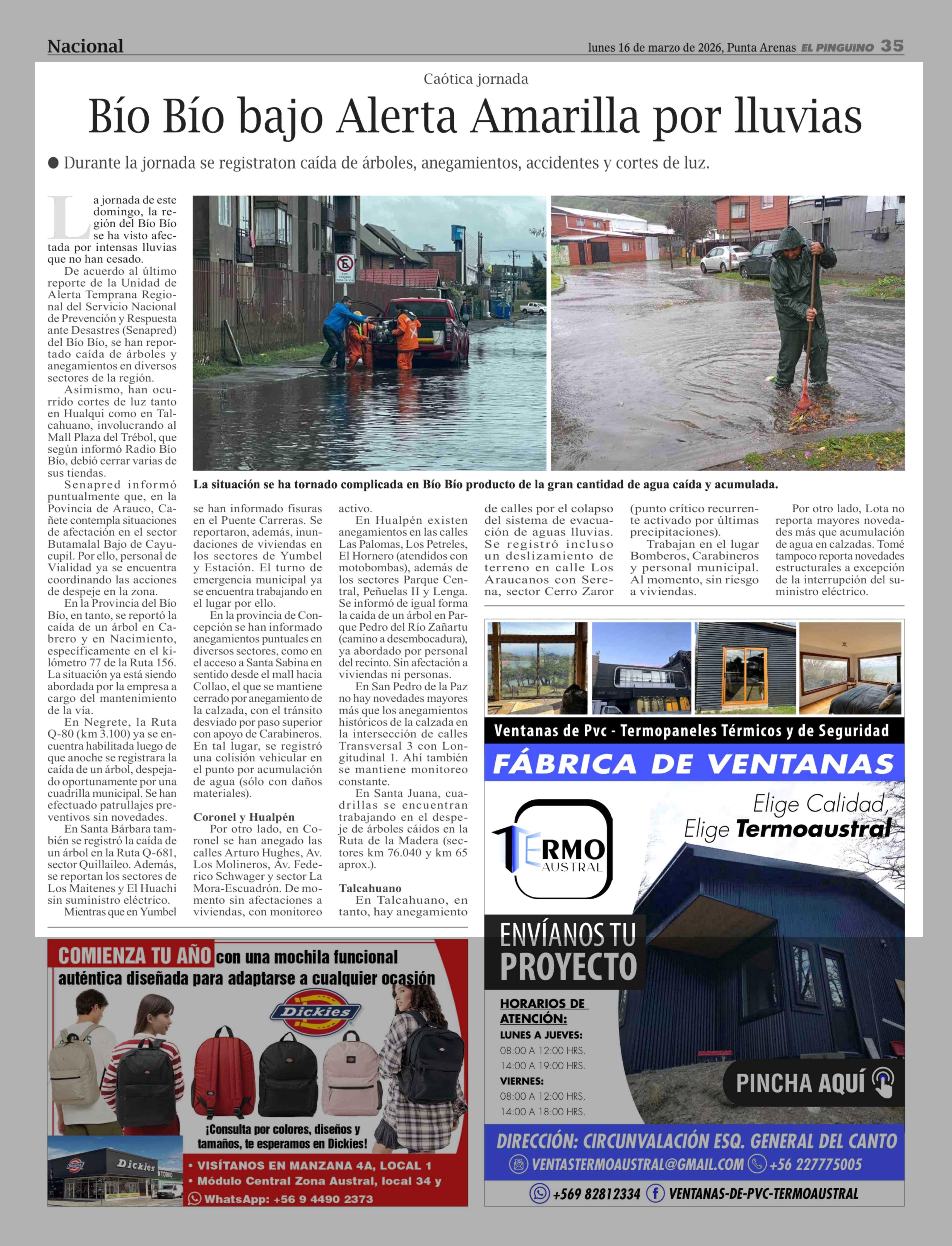 Bío Bío bajo Alerta Amarilla por lluvias 16-03-2026 El Pingüino |