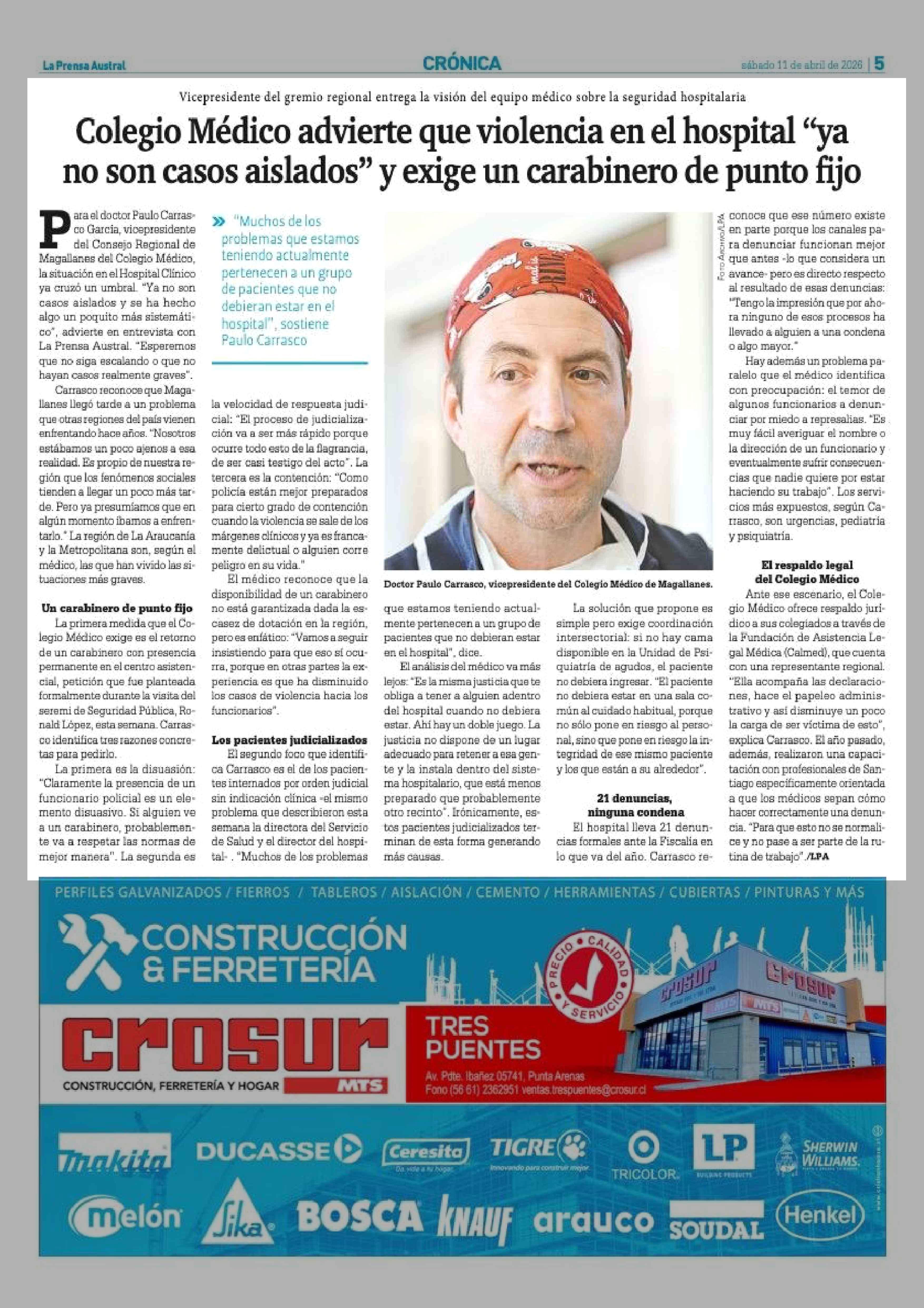 Colegio Médico advierte que violencia en el hospital "ya no son casos aislados" y exige un carabinero de punto fijo 11-04-2026 La Prensa Austral |