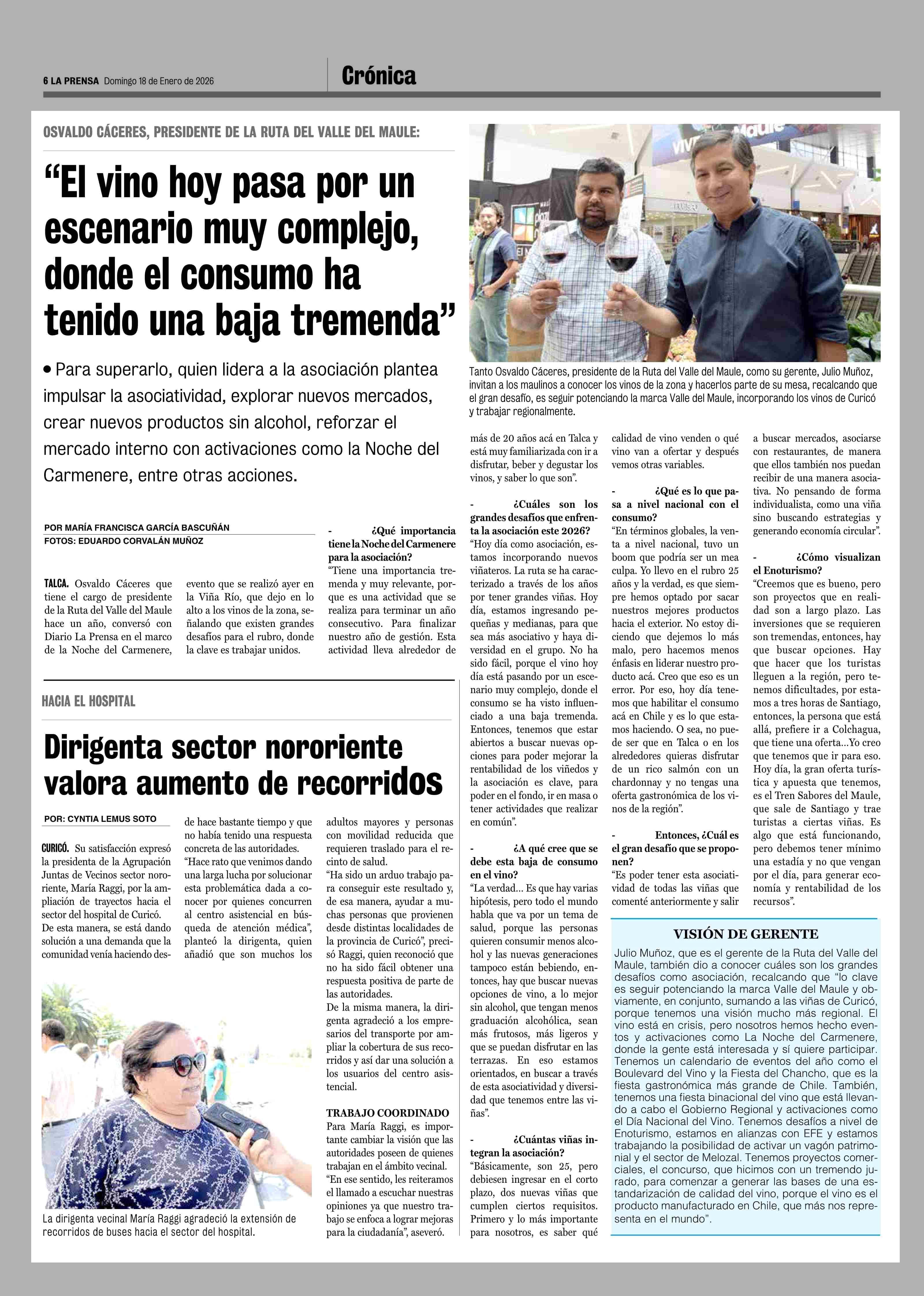 "El vino hoy pasa por un escenario muy complejo, donde el consumo ha tenido una baja tremenda" 18-01-2026 La Prensa de Curicó |