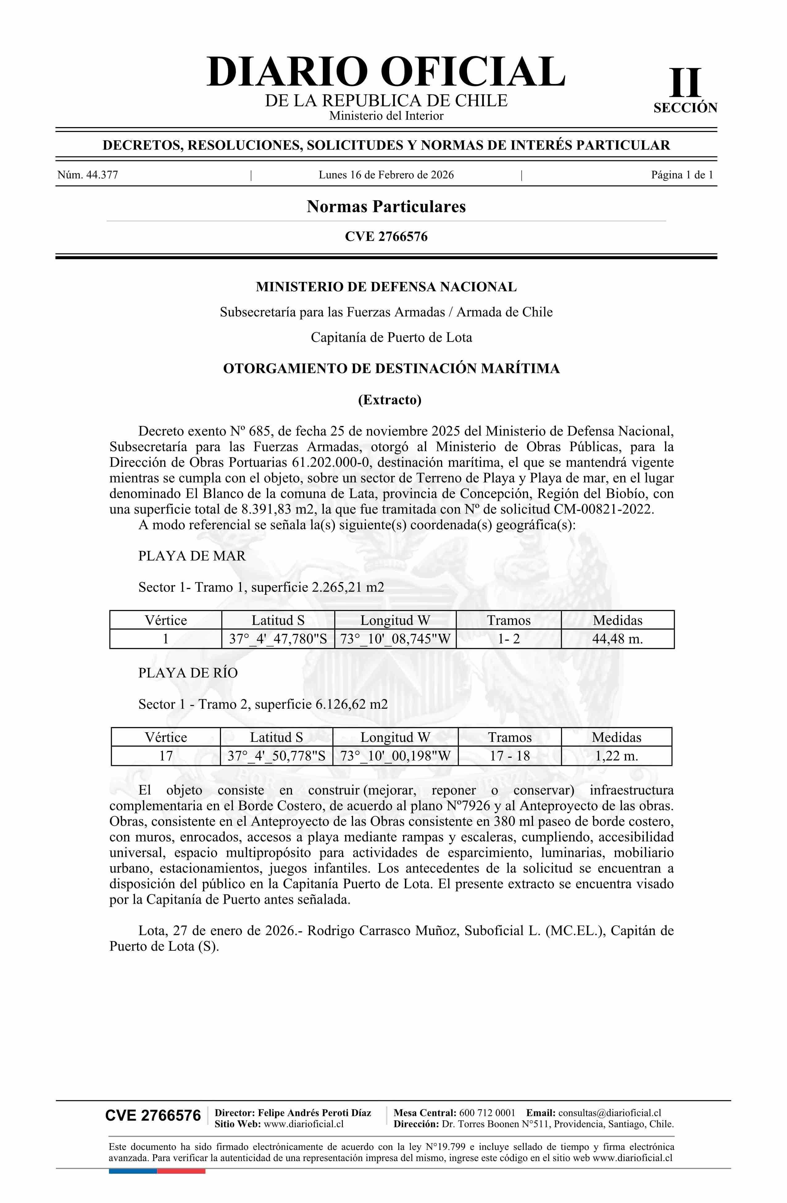 Extracto de decreto exento número 685, de 2025.- Otorgamiento de destinación marítima 16-02-2026 Diario Oficial Edición Electrónica |
