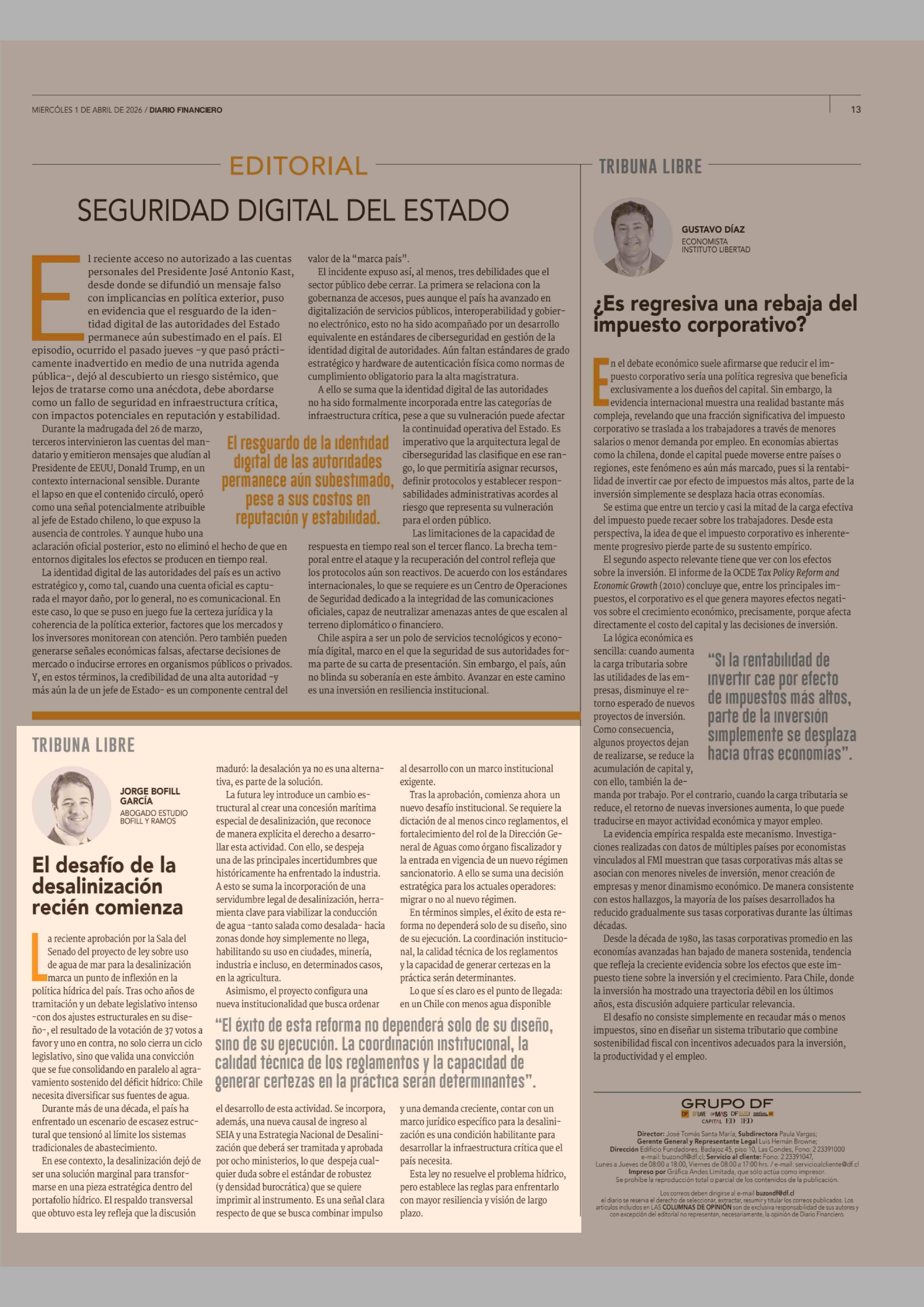 Columnas de Opinión: El desafío de la desalinización recién comienza 01-04-2026 Diario Financiero |