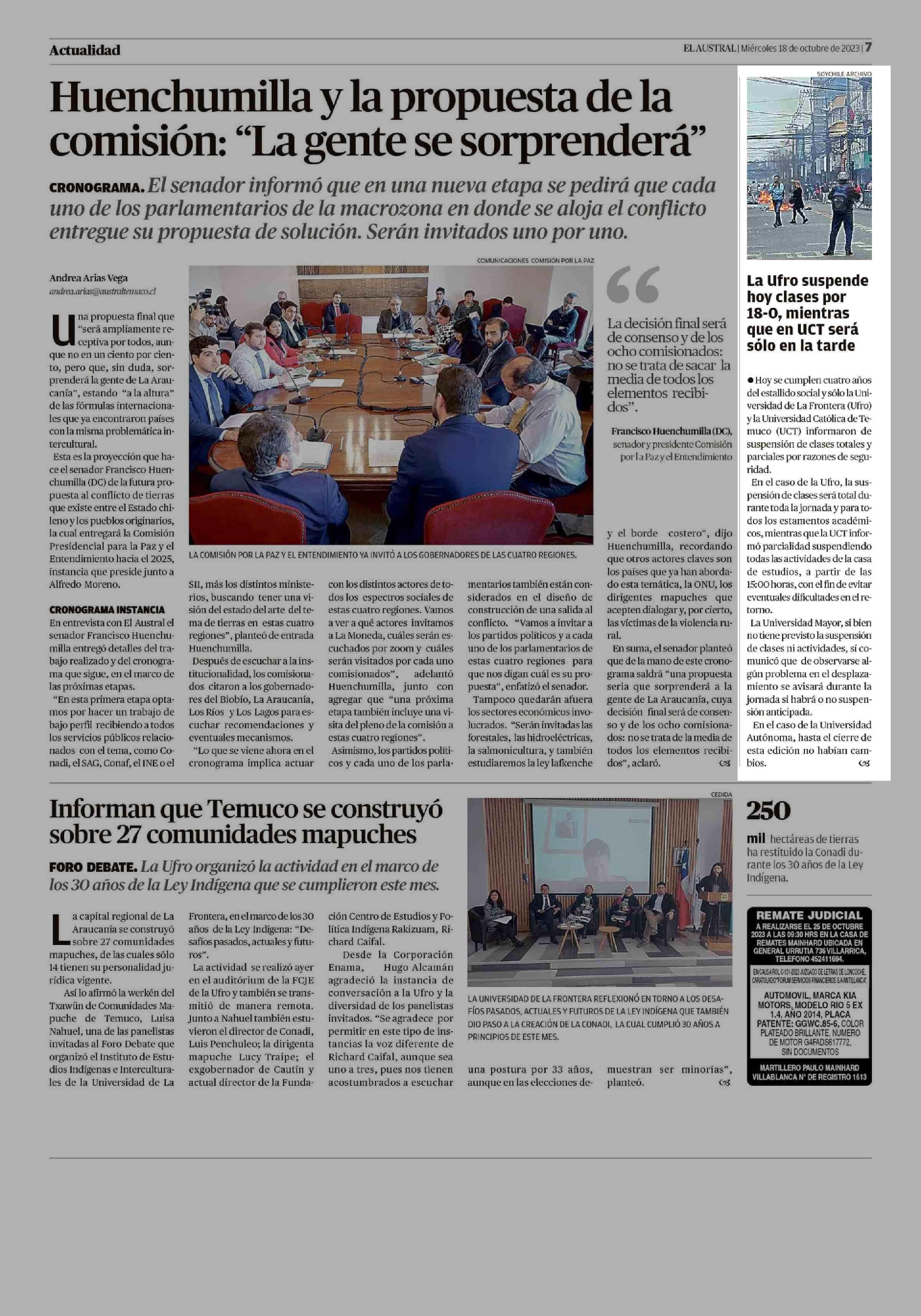La Ufro suspende hoy clases por 18-0, mientras que en UCT será sólo en la tarde 18-10-2023 El Austral de la Araucanía |