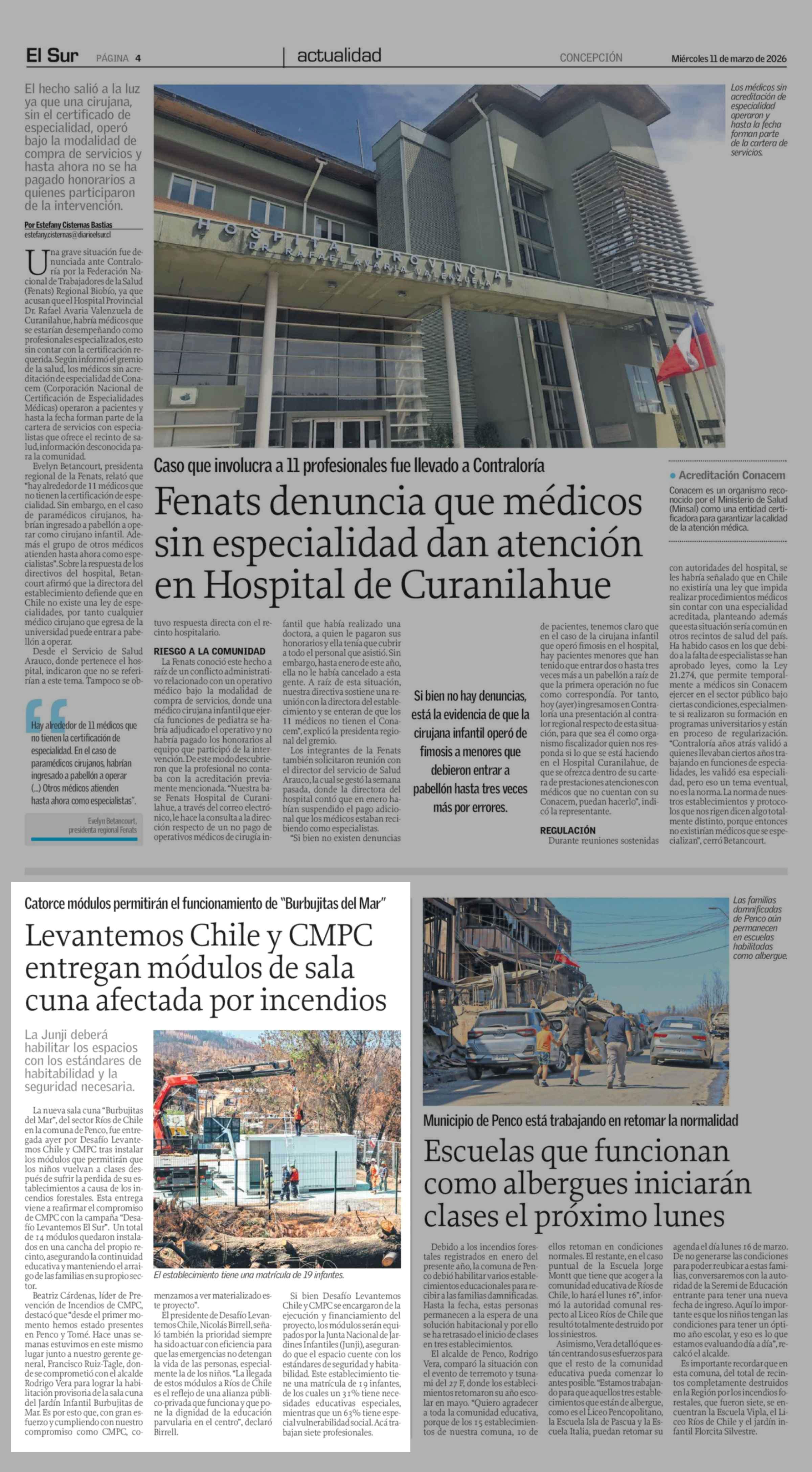 Levantemos Chile y CMPC entregan módulos de sala cuna afectada por incendios 11-03-2026 El Sur |