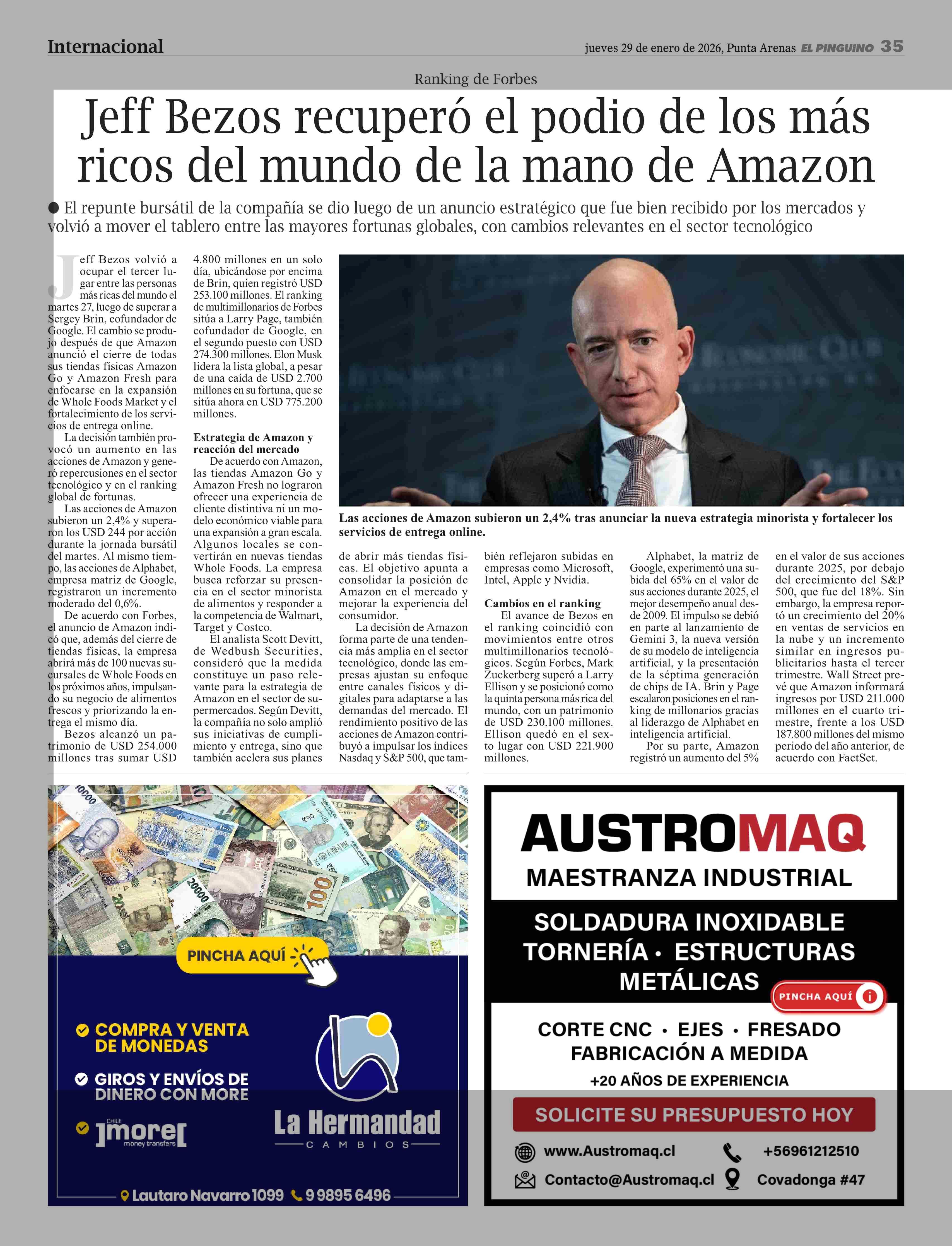 Jeff Bezos recuperó el podio de los más ricos del mundo de la mano de Amazon 29-01-2026 El Pingüino |
