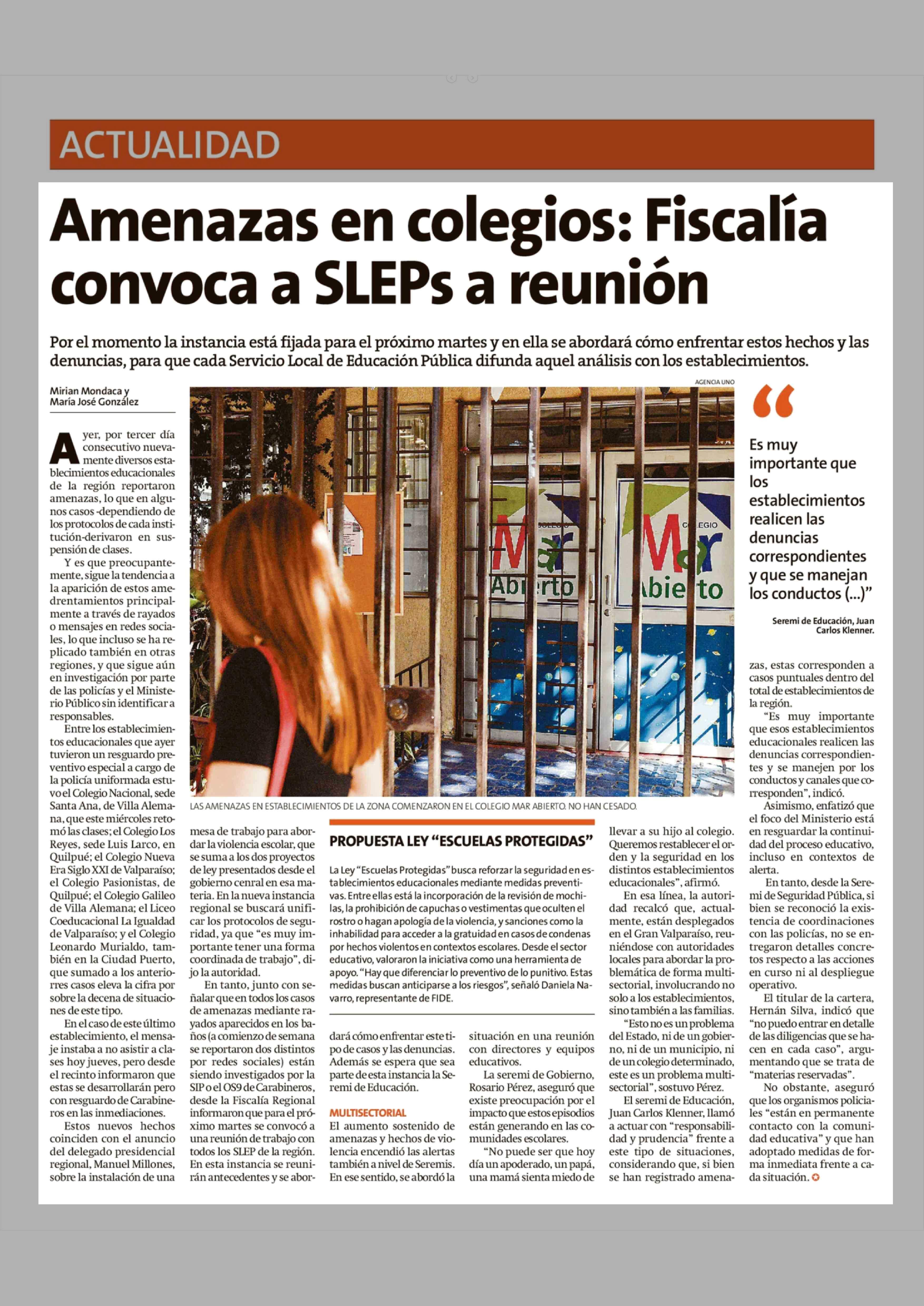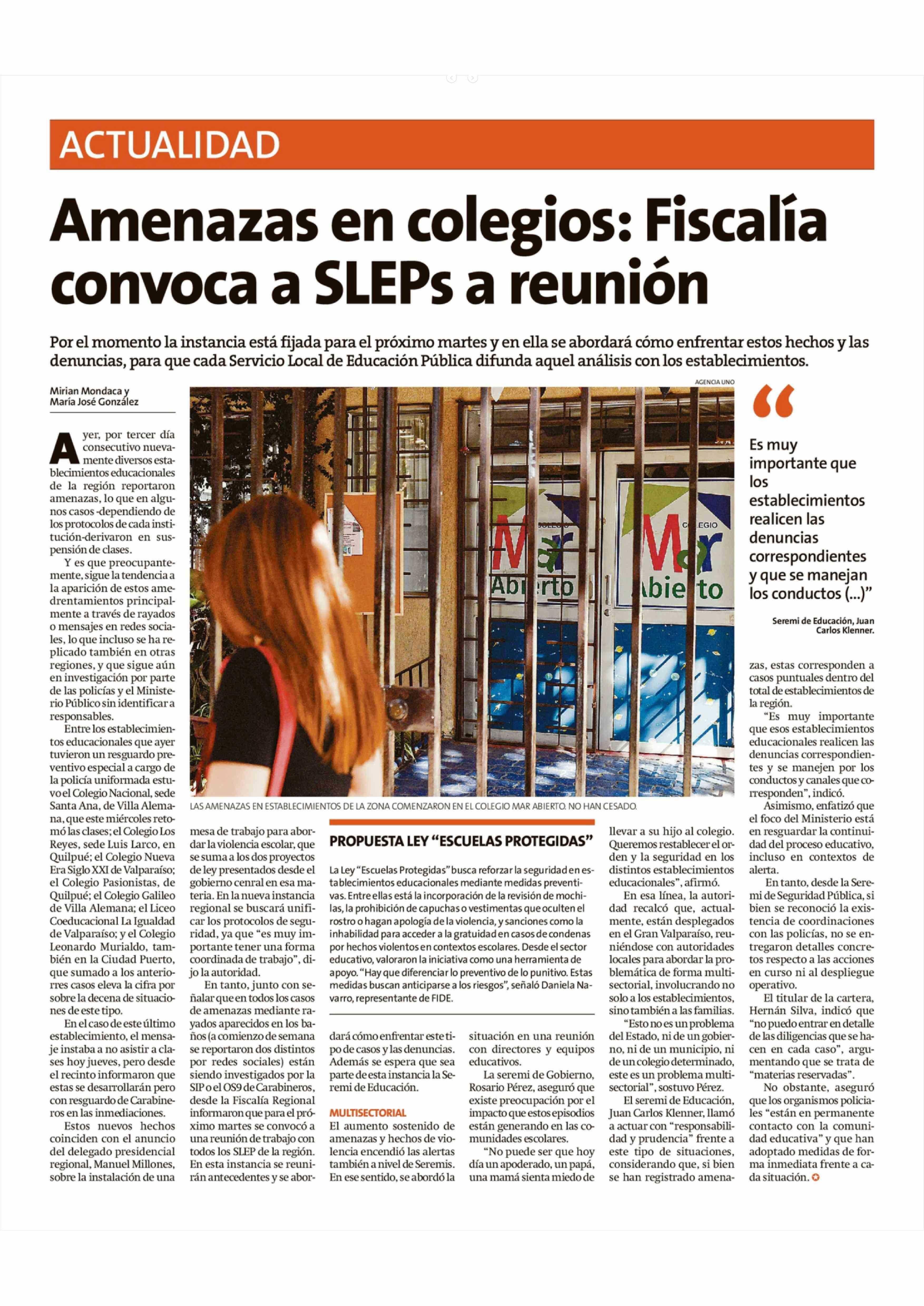 Título: Amenazas en colegios: Fiscalía convoca a SLEPs a reunión