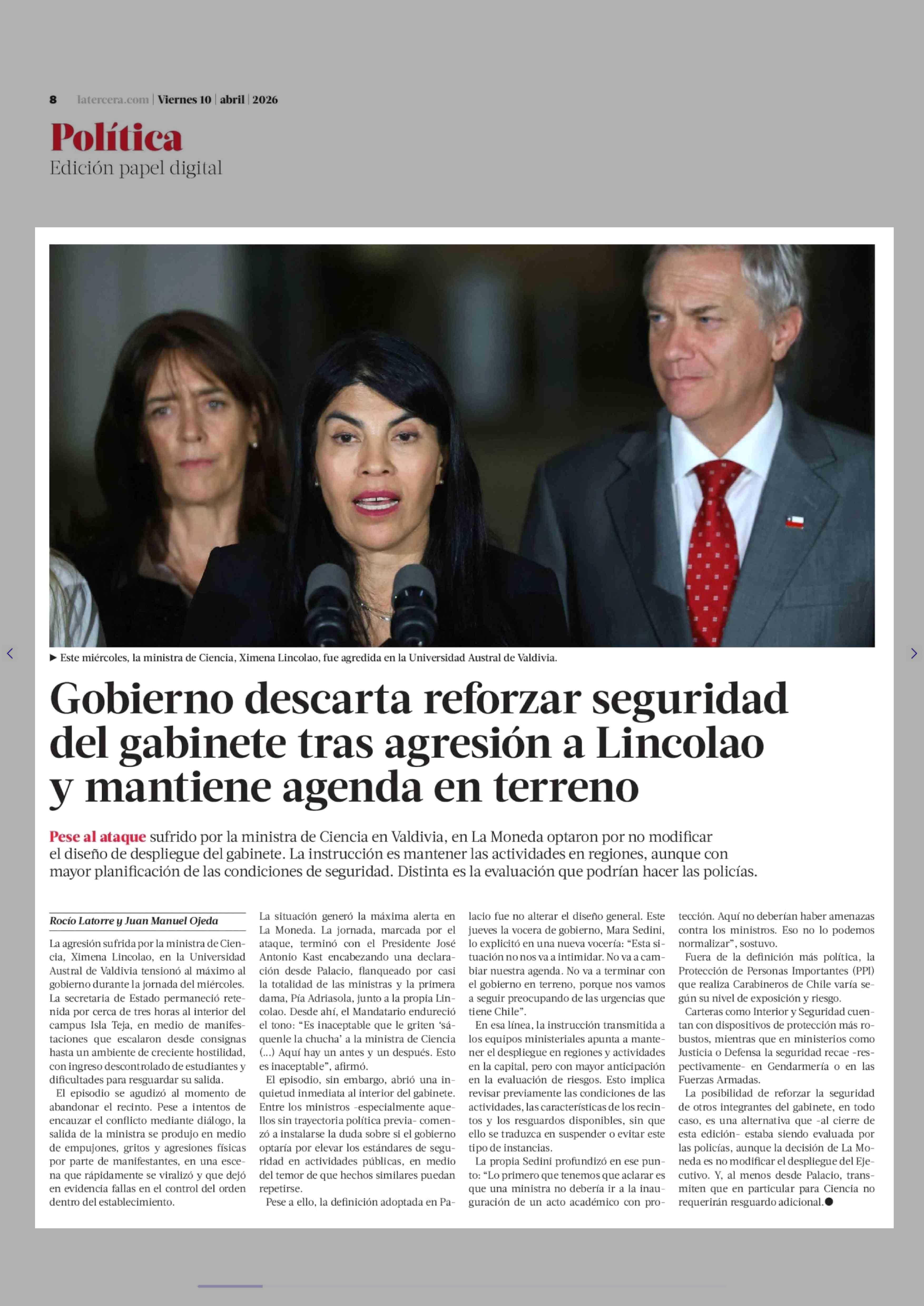 Gobierno descarta reforzar seguridad del gabinete tras agresión a Lincolao y mantiene agenda en terreno 10-04-2026 La Tercera |