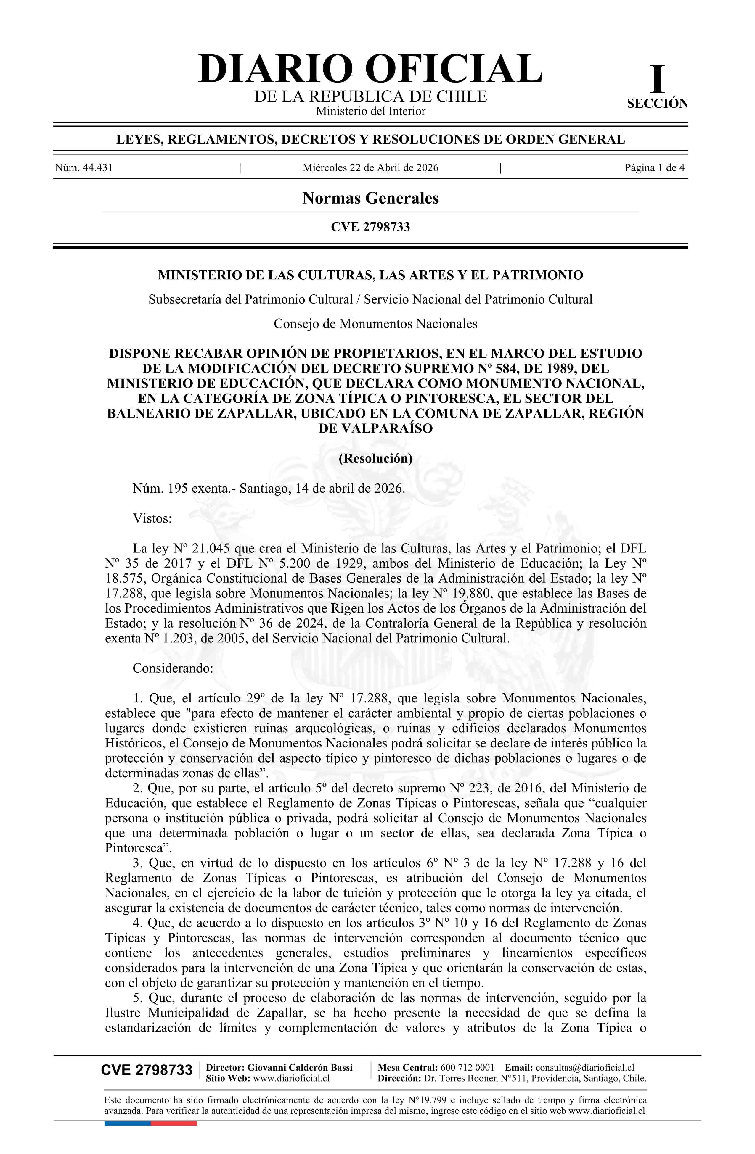 Título: Resolución exenta número 195, de 2026.- Dispone recabar opinión de propietarios, en el marco del estudio de la modificación del decreto N° 584, de 1989, del Ministerio de Educación, que declara como Monumento Nacional, en la Categoría de Zona Típica o Pintoresca, el sector del balneario de Zapallar,