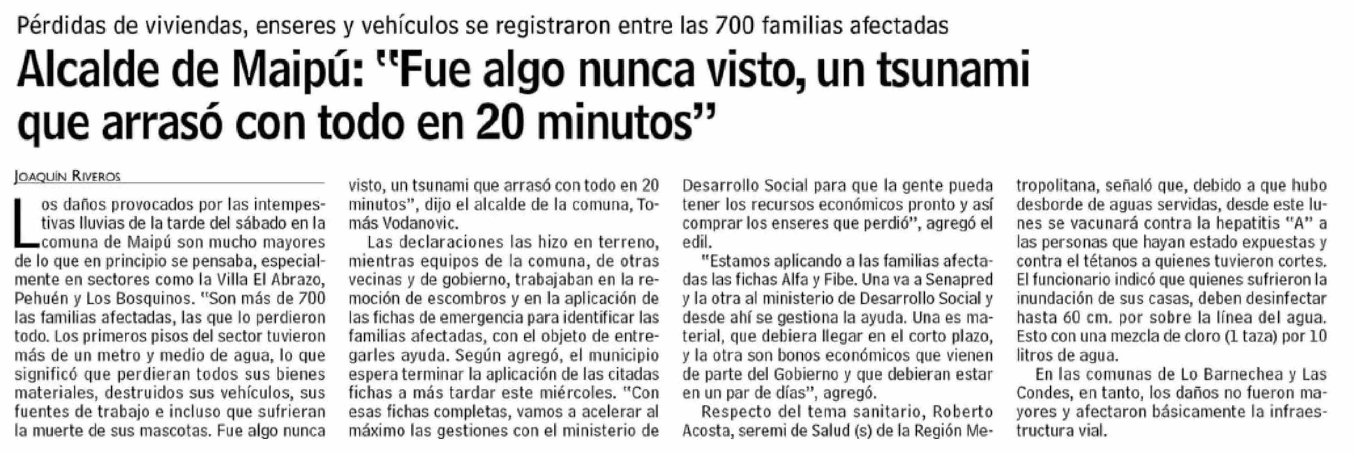 | Título: | Alcalde de Maipú: "Fue algo nunca visto, un tsunami que arraso con todo en 20 minutos" |