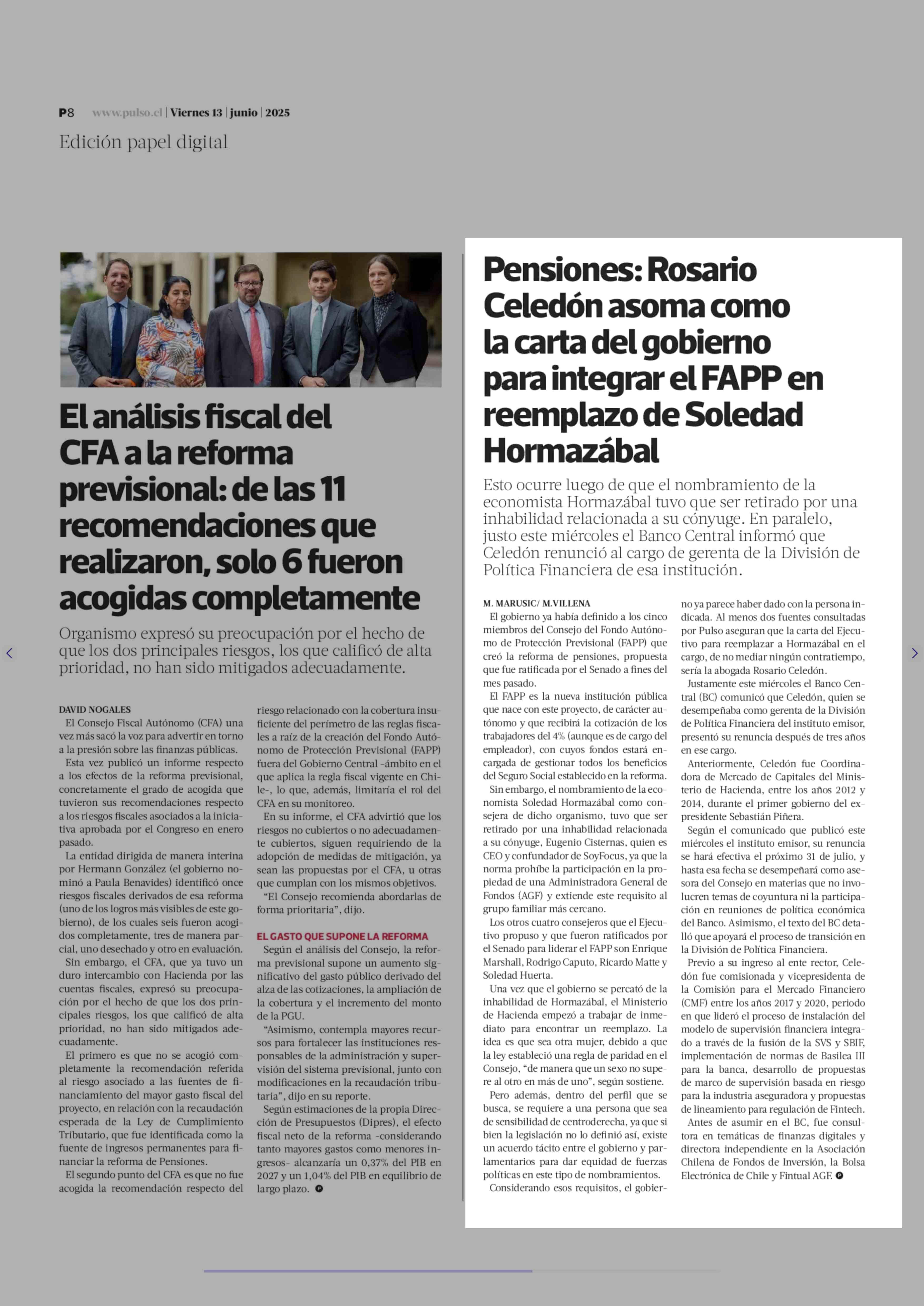 Pensiones: Rosario Celedón asoma como la carta del gobierno para integrar el FAPP en reemplazo de Soledad Hormazábal 13-06-2025 La Tercera |
