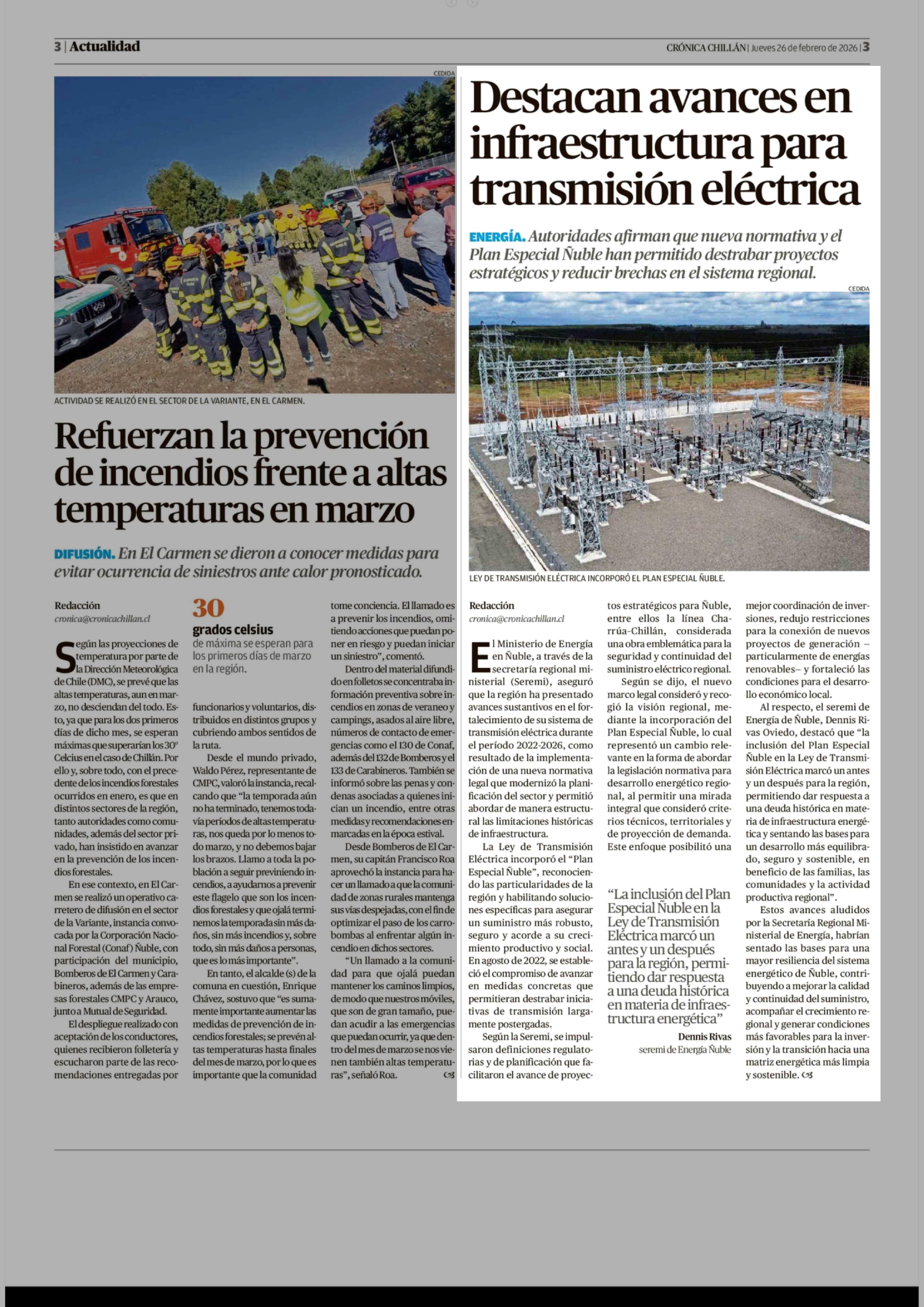 Destacan avances en infraestructura para transmisión eléctrica 26-02-2026 Crónica de Chillán |