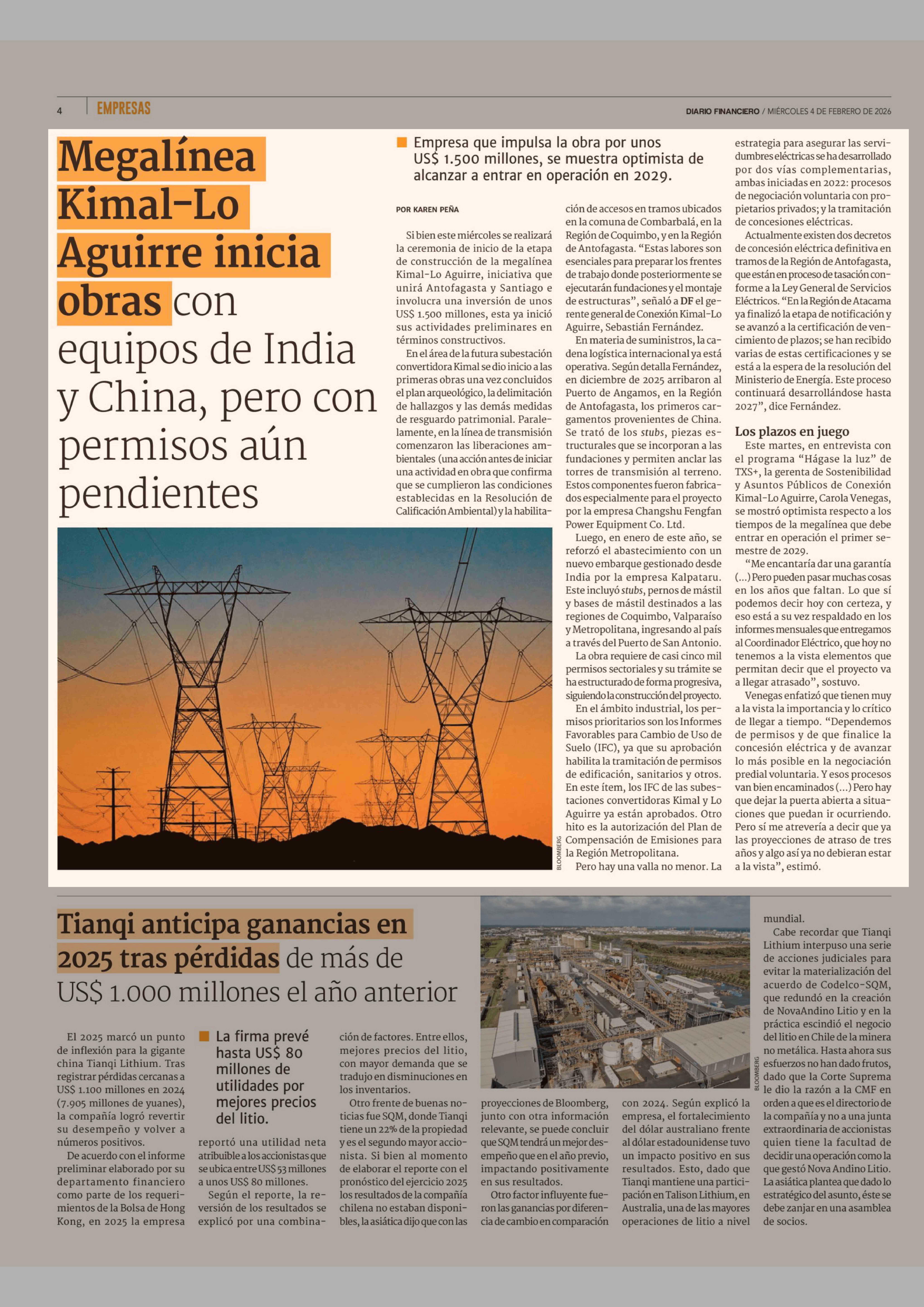 Megalínea Kimal-Lo Aguirre inicia obras con equipos de India y China, pero con permisos aún pendientes 04-02-2026 Diario Financiero |