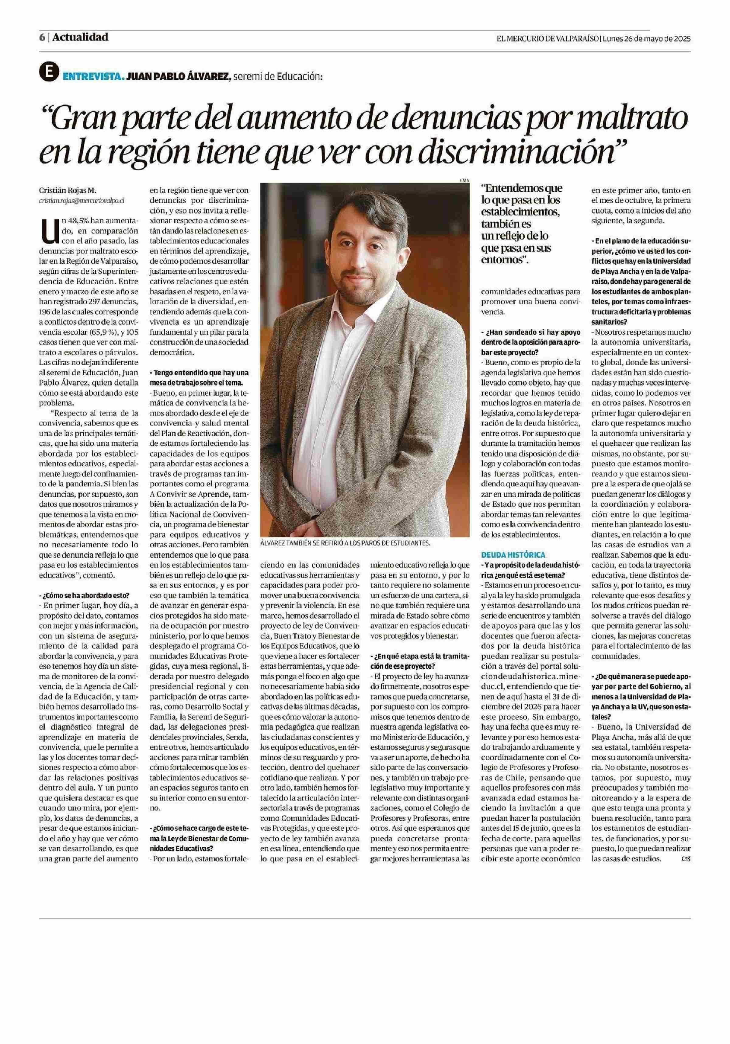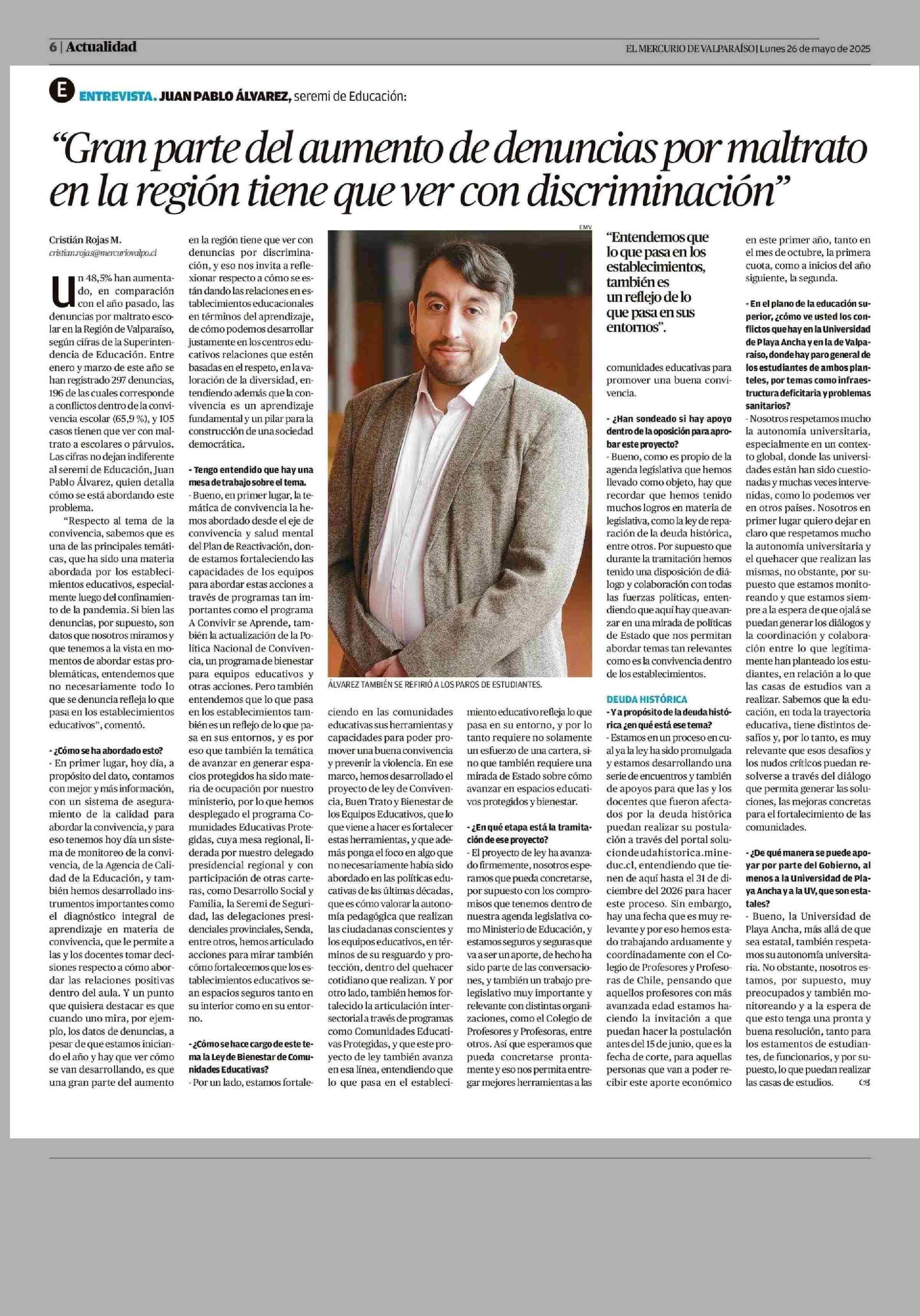 “Gran parte del aumento de denuncias por maltrato en la región tiene que ver con discriminación” 26-05-2025 El Mercurio de Valparaíso |