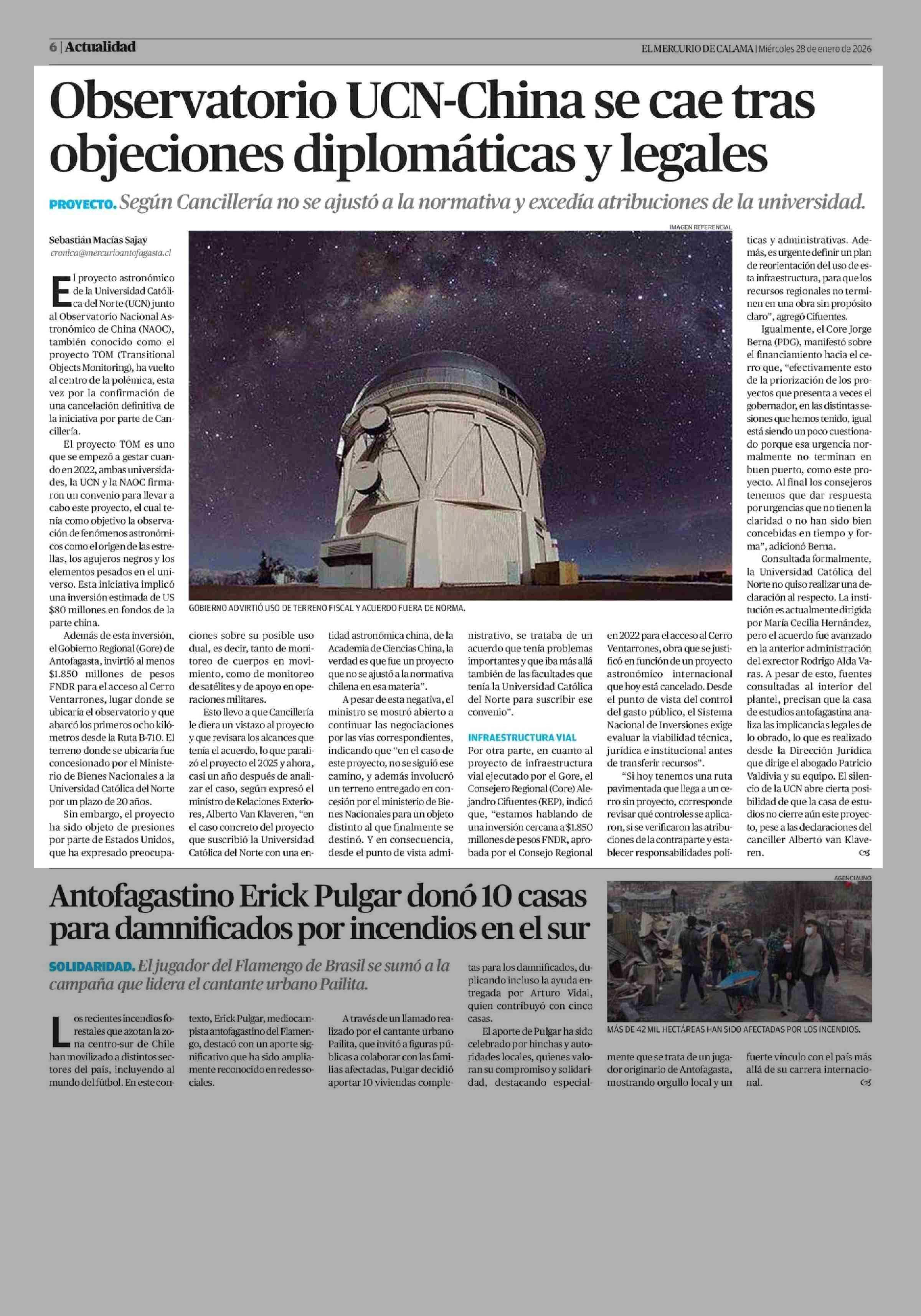 Observatorio UCN-China se cae tras objeciones diplomáticas y legales 28-01-2026 El Mercurio de Calama |