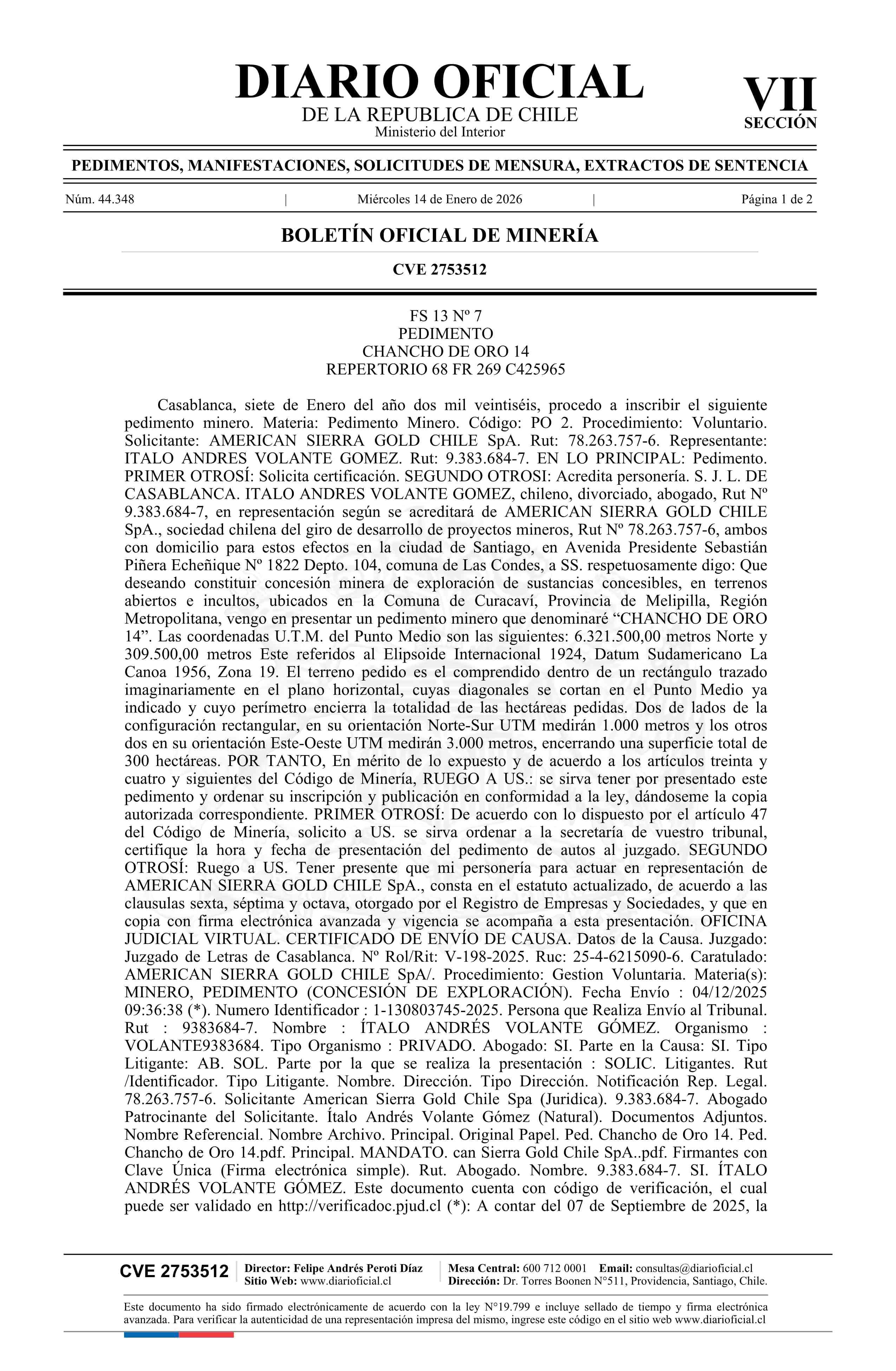 CHANCHO DE ORO 14 / American Sierra Gold Chile SpA 14-01-2026 DIARIO OFICIAL CHILE - BOLETÍN OFICIAL DE MINERÍA |