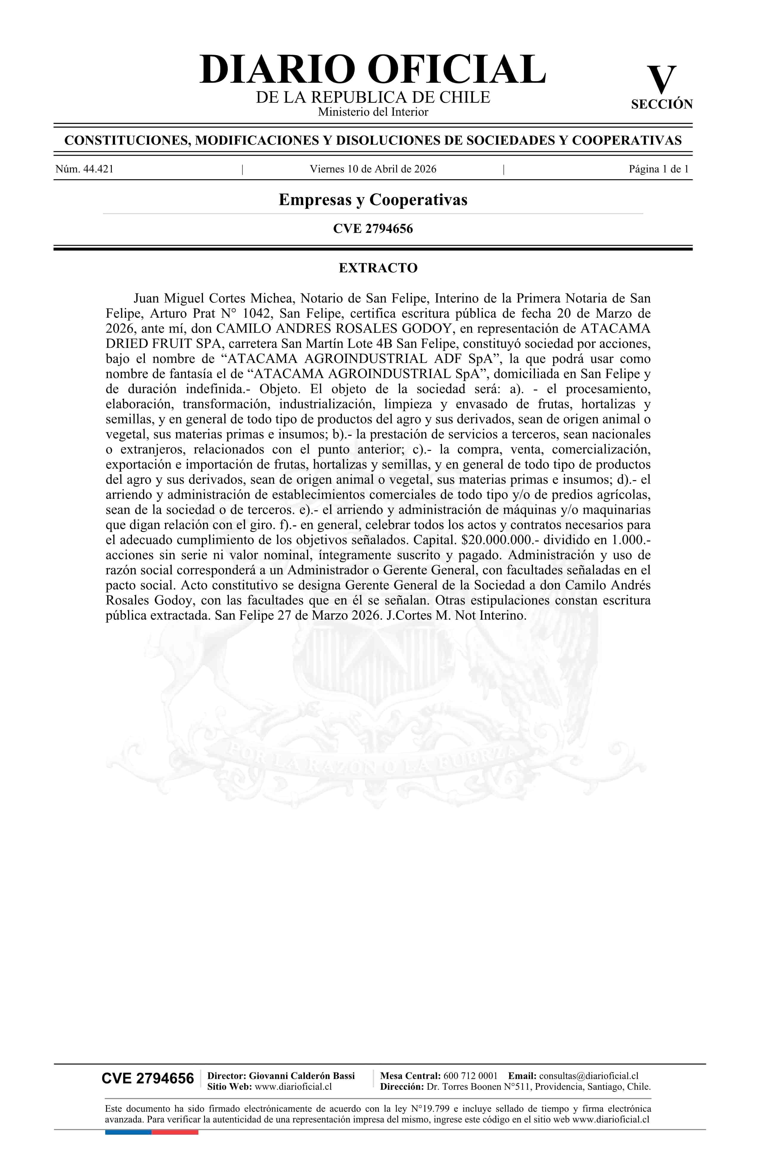 ATACAMA AGROINDUSTRIAL ADF SpA 10-04-2026 Diario Oficial Edición Electrónica |