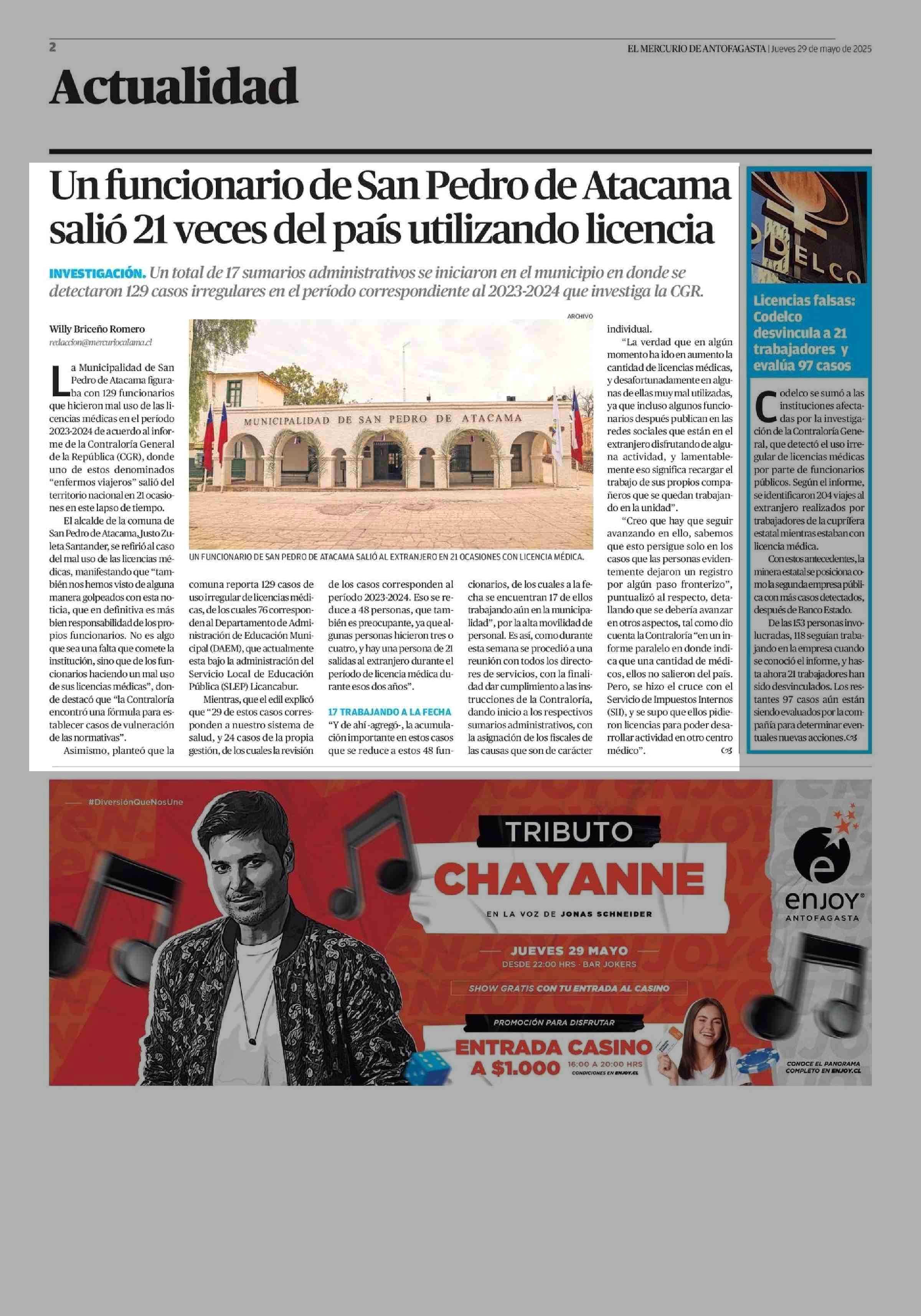 Un funcionario de San Pedro de Atacama salió 21 veces del país utilizando licencia 29-05-2025 El Mercurio de Antofagasta |