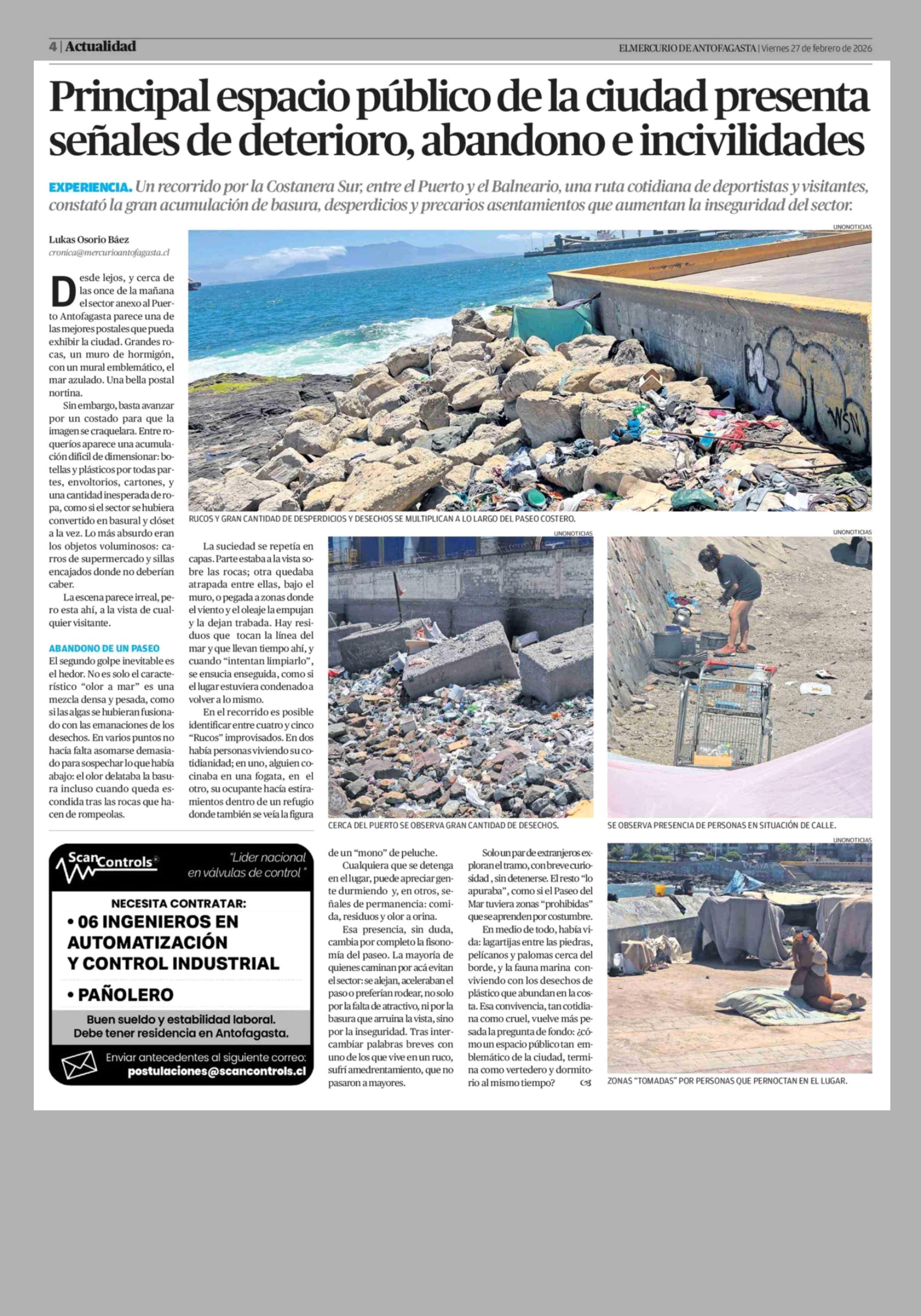 Principal espacio público de la ciudad presenta señales de deterioro, abandono e incivilidades 27-02-2026 El Mercurio de Antofagasta |
