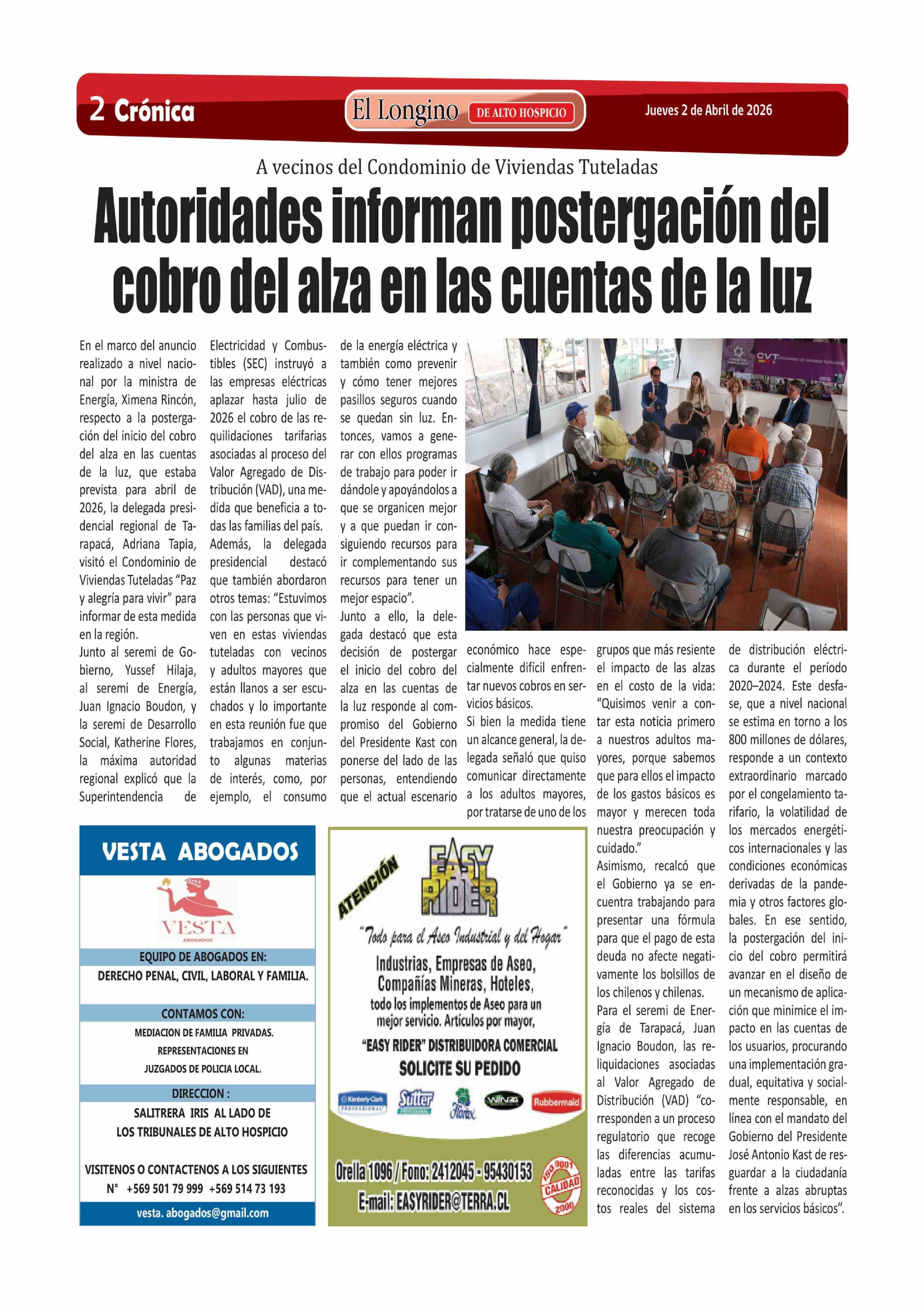 | Fecha: | 02-04-2026 | Sector: | Noticia general | Región: | Región de Tarapacá |