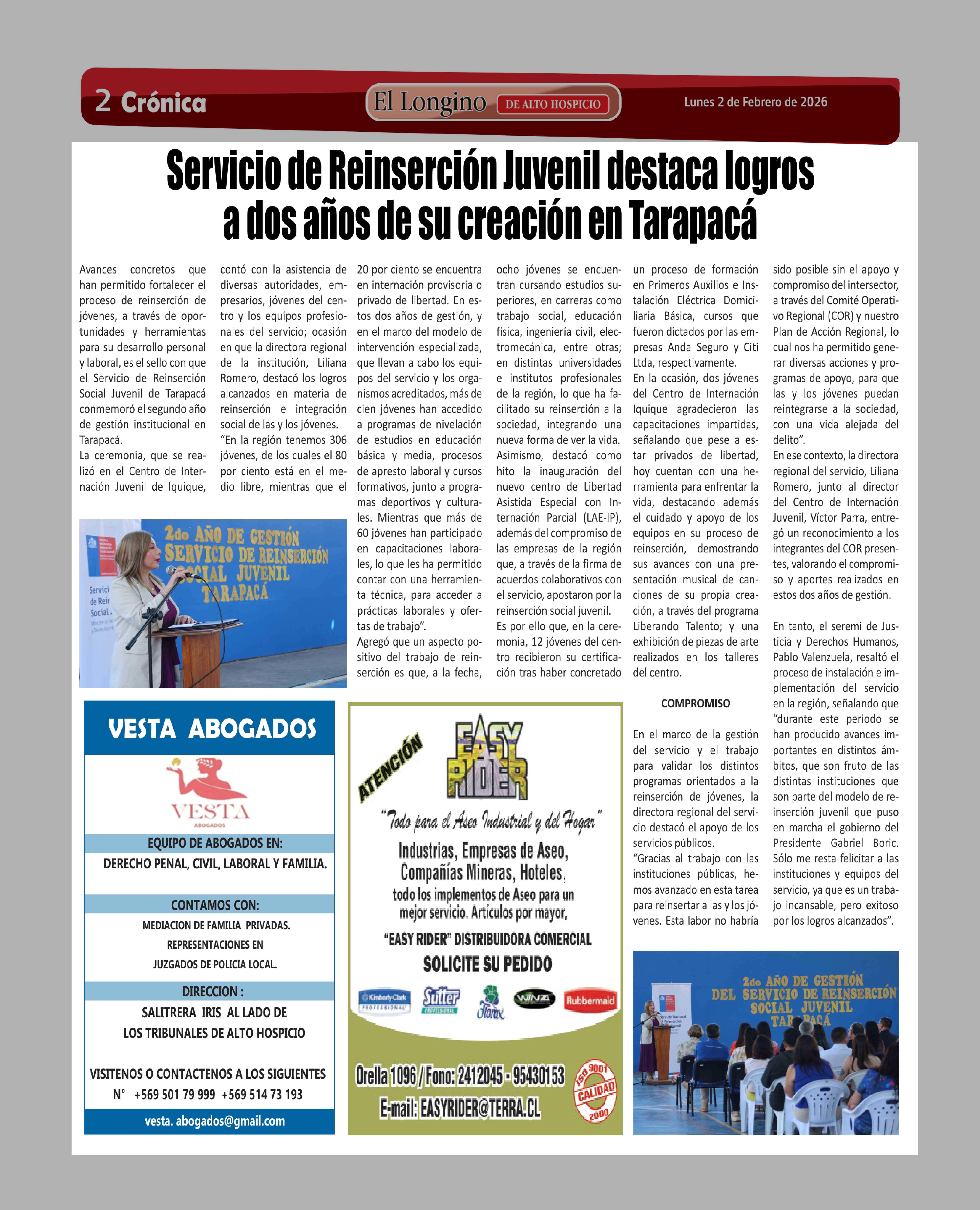 Servicio de Reinserción Juvenil destaca logros a dos años de su creación en Tarapacá 02-02-2026 El Longino |