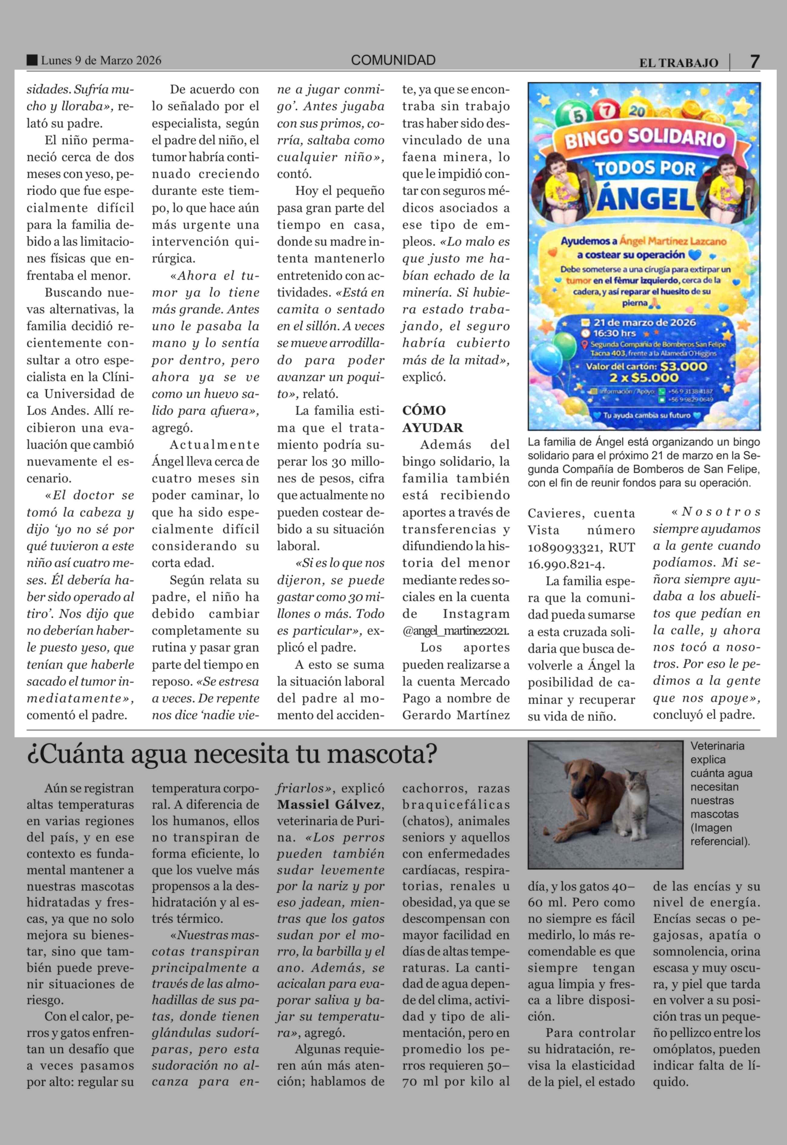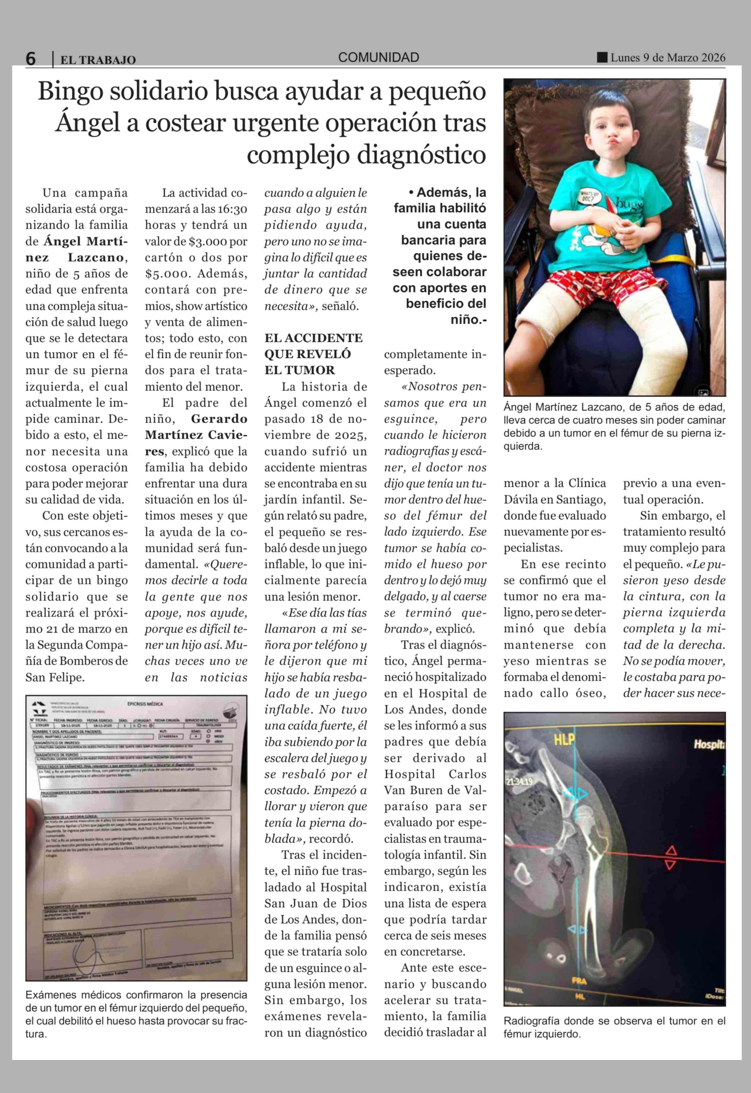 Bingo solidario busca ayudar a pequeño Ángel a costear urgente operación tras complejo diagnóstico 09-03-2026 El Trabajo |