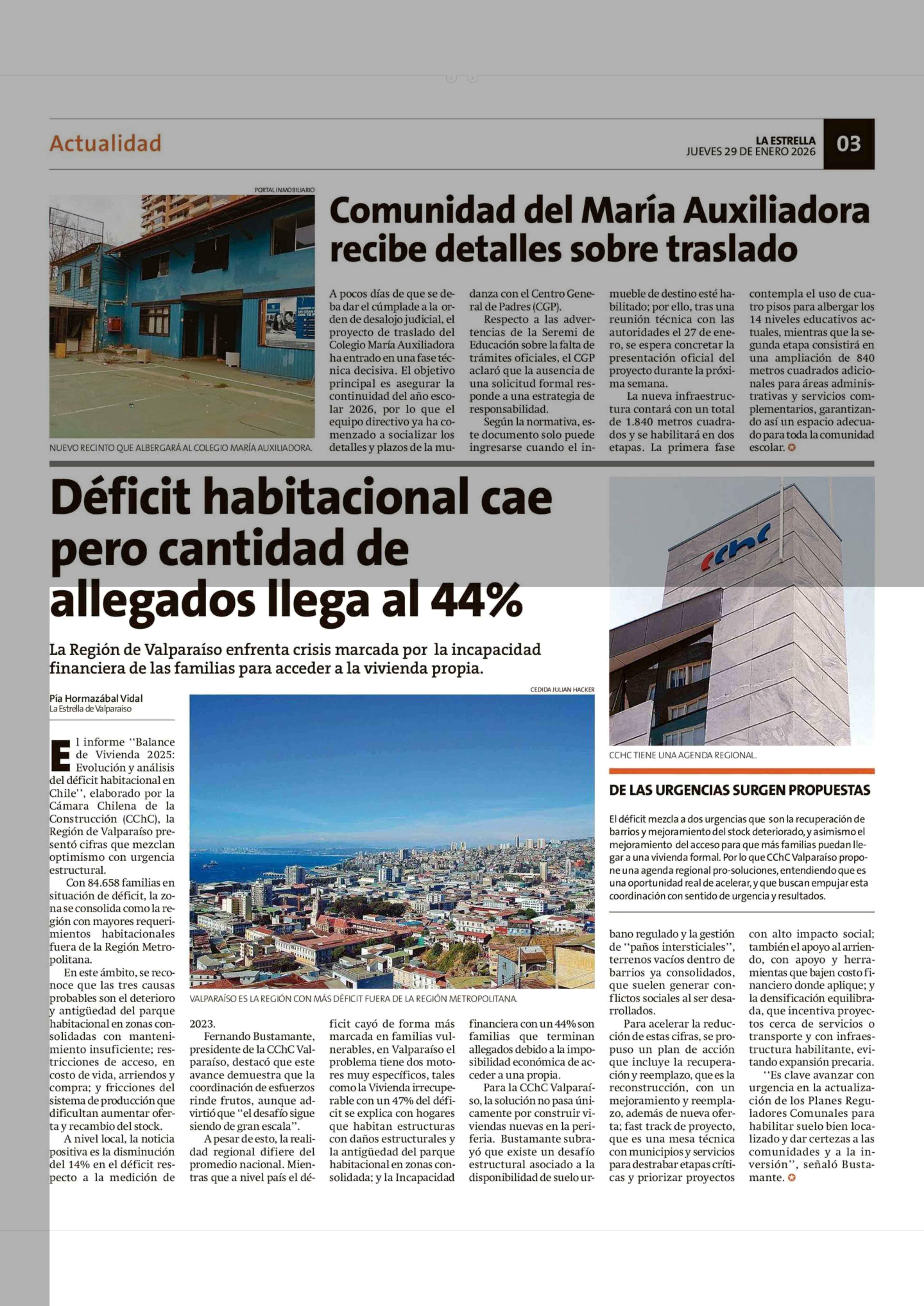 Déficit habitacional cae pero cantidad de allegados llega al 44% 29-01-2026 La Estrella de Valparaíso |