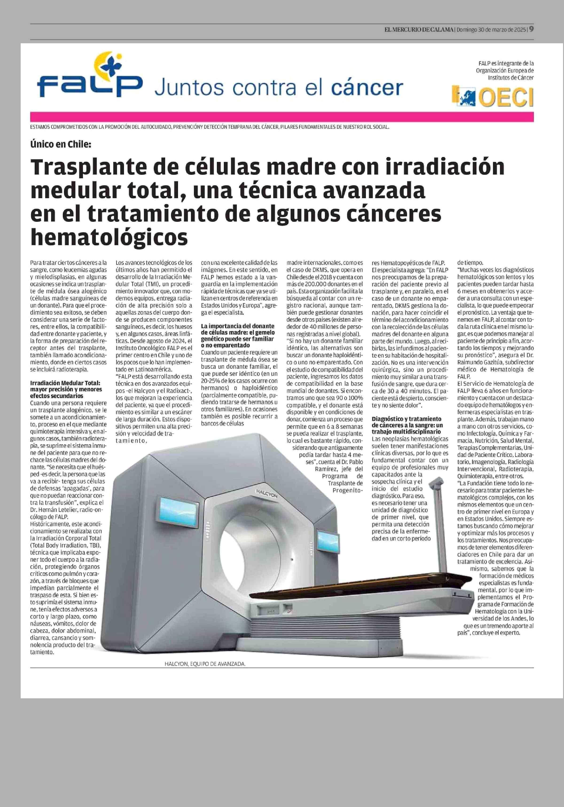 Trasplante de células madre con irradiación medular total, una técnica avanzada en el tratamiento de algunos cánceres hematológicos 30-03-2025 El Mercurio de Calama |