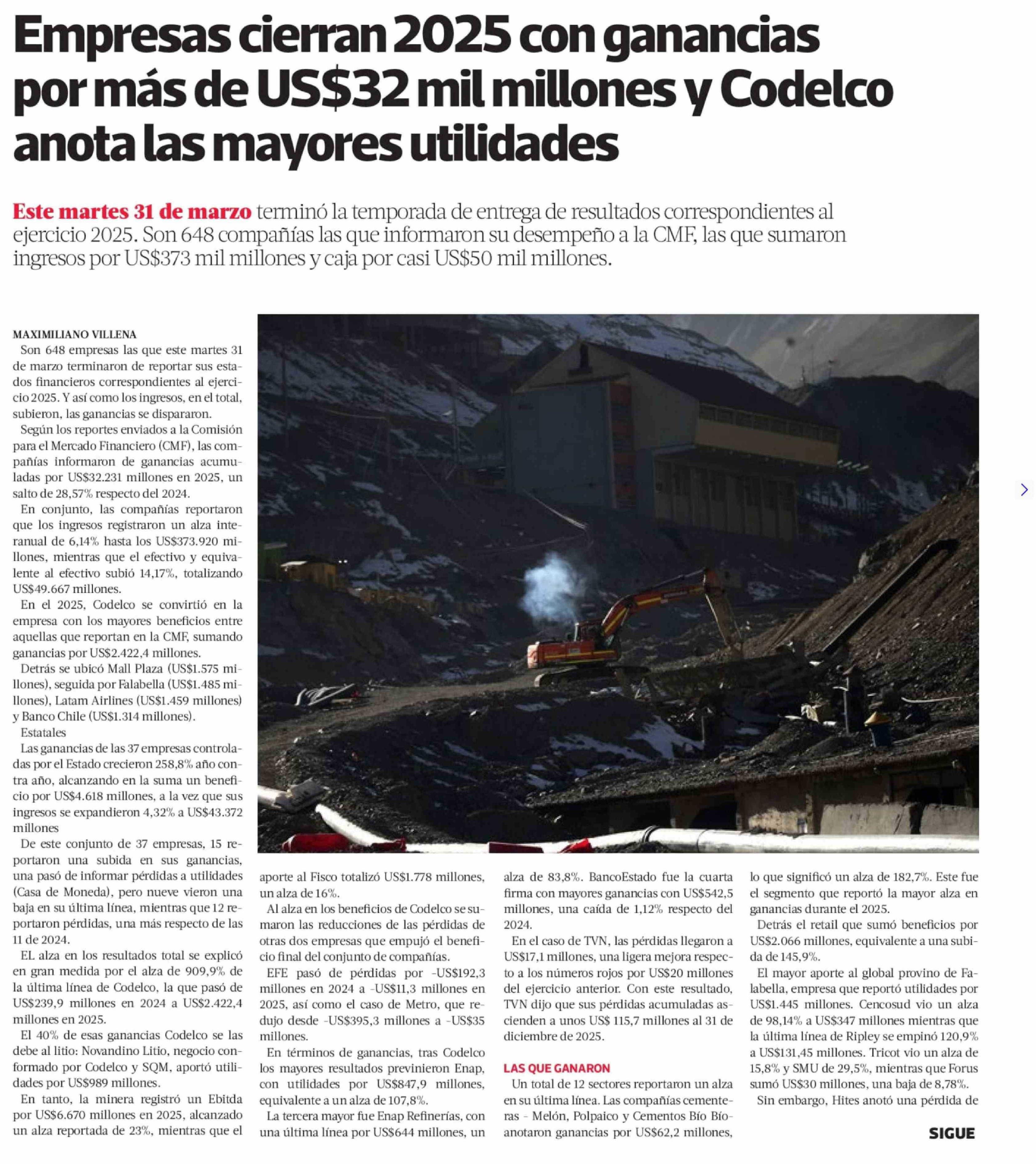 Empresas cierran 2025 con ganancias por más de US$32 mil millones y Codelco anota las mayores utilidades 02-04-2026 La Tercera |