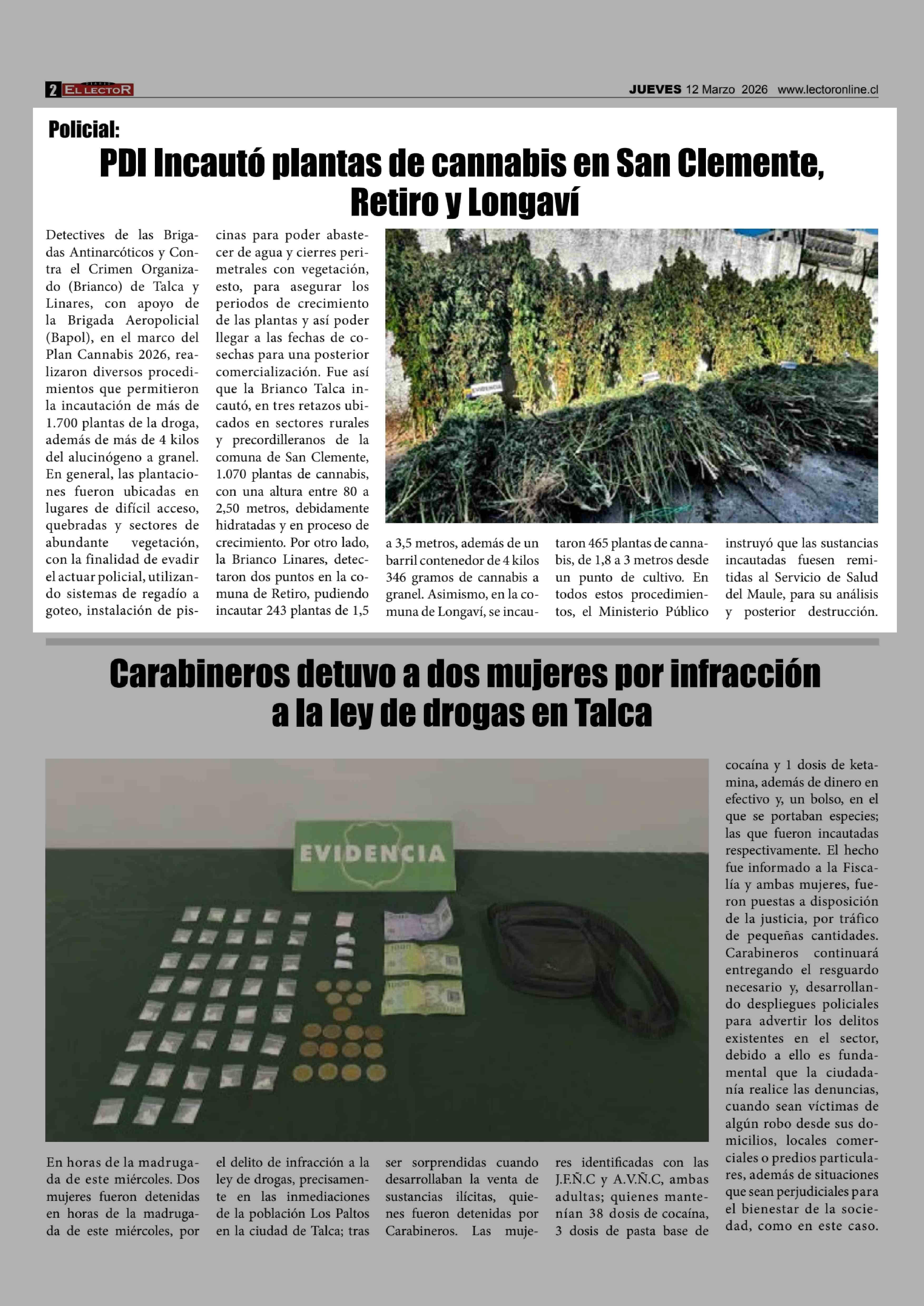 PDI Incautó plantas de cannabis en San Clemente, Retiro y Longaví 12-03-2026 El Lector |