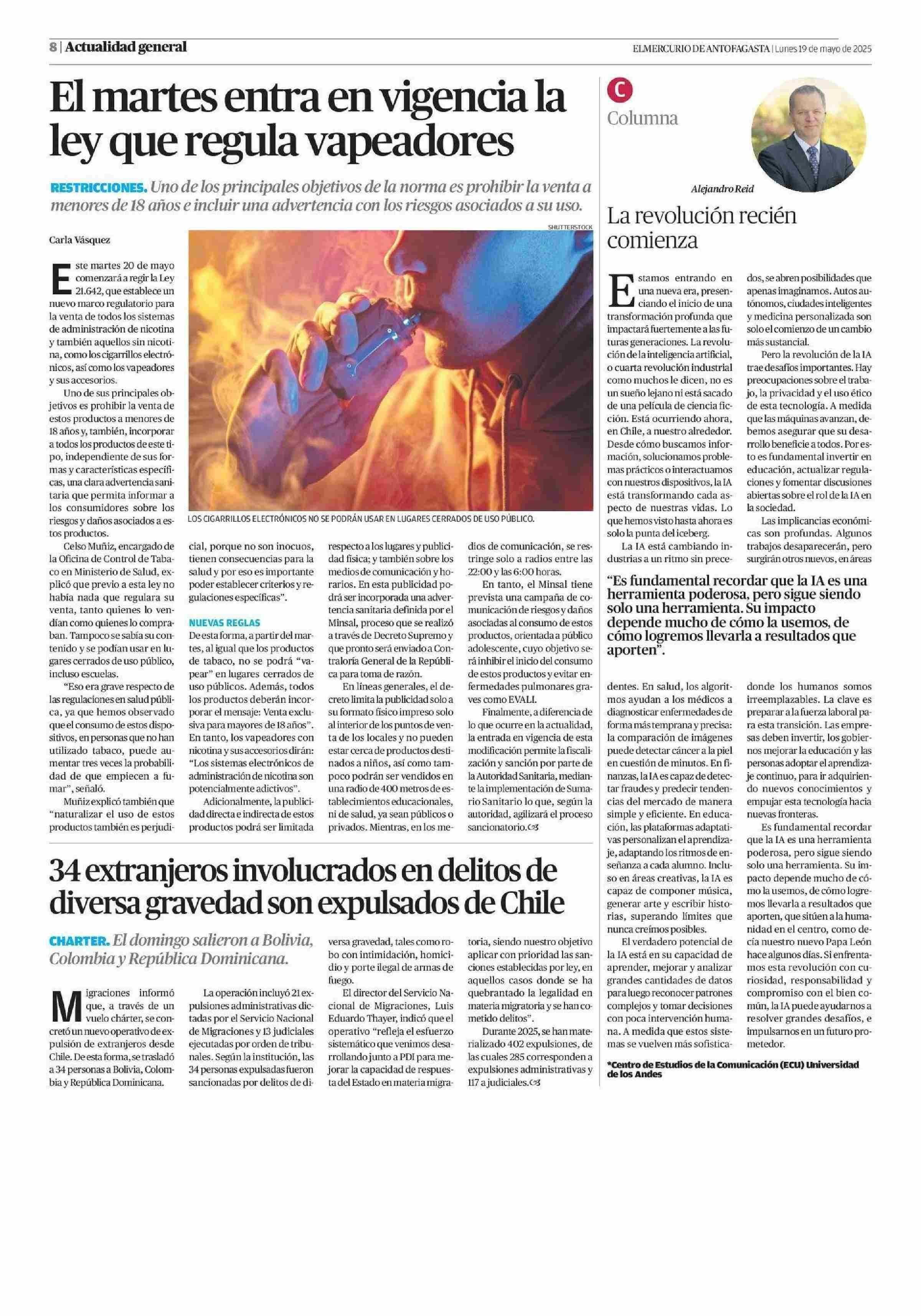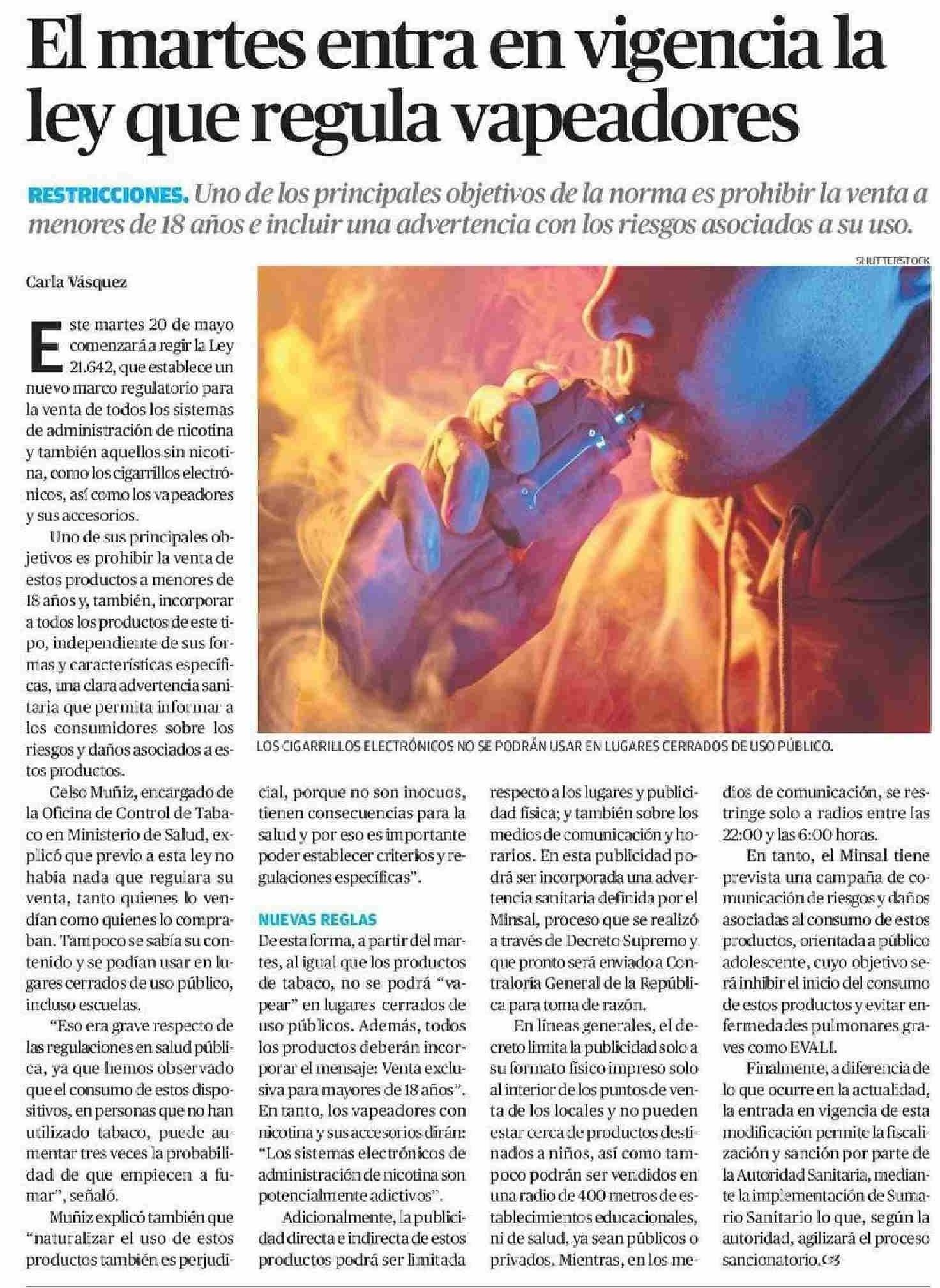 El martes entra en vigencia la ley que regula vapeadores 19-05-2025 El Mercurio de Antofagasta |