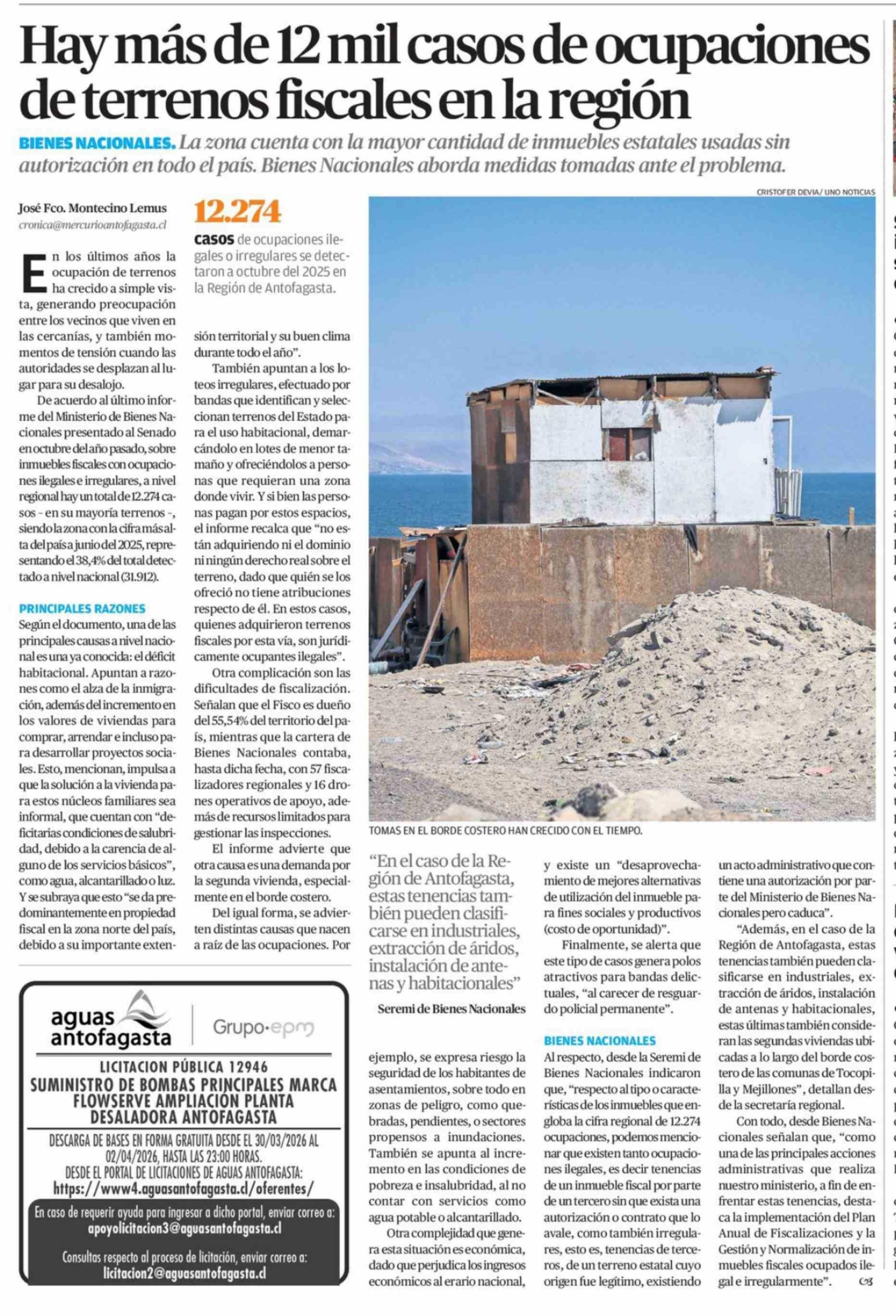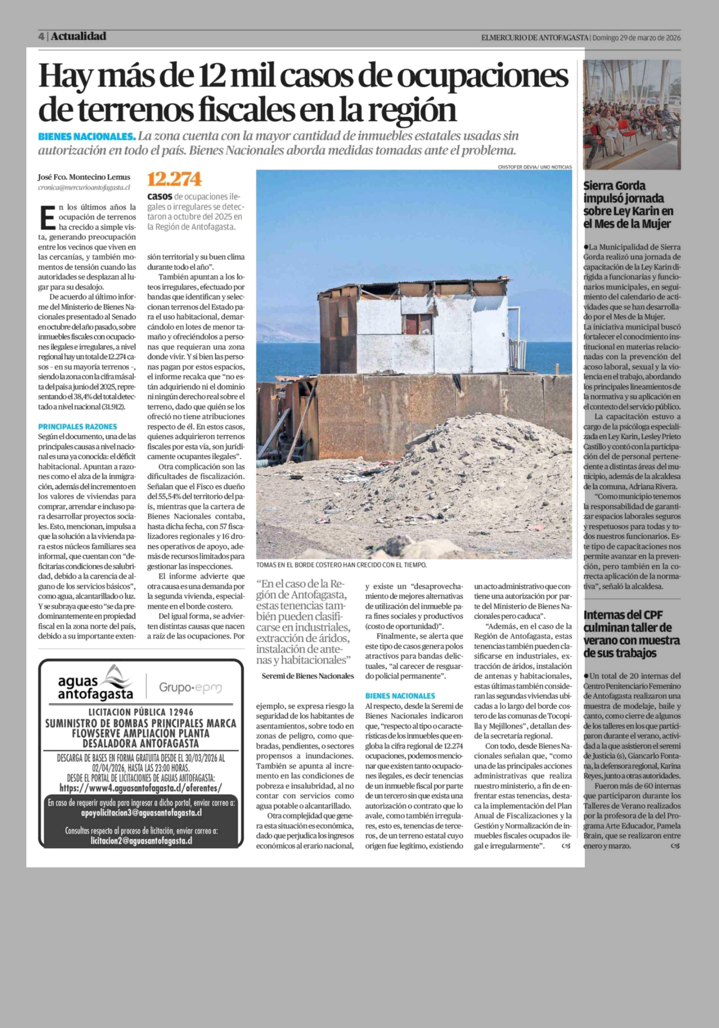 Hay más de 12 mil casos de ocupaciones de terrenos fiscales en la región 29-03-2026 El Mercurio de Antofagasta |
