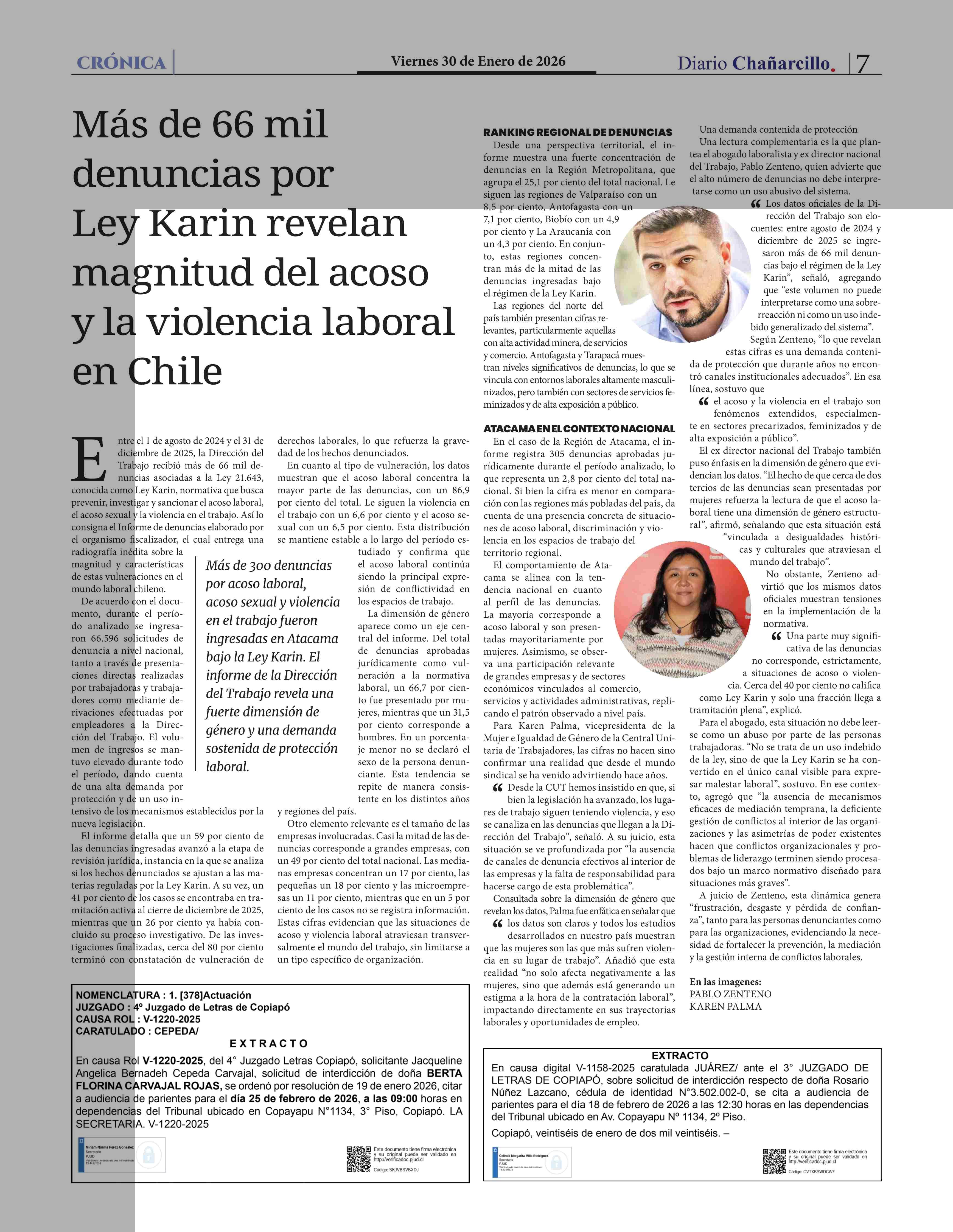 Más de 66 mil denuncias por Ley Karin revelan magnitud del acoso y la violencia laboral en Chile 30-01-2026 Diario Chañarcillo |