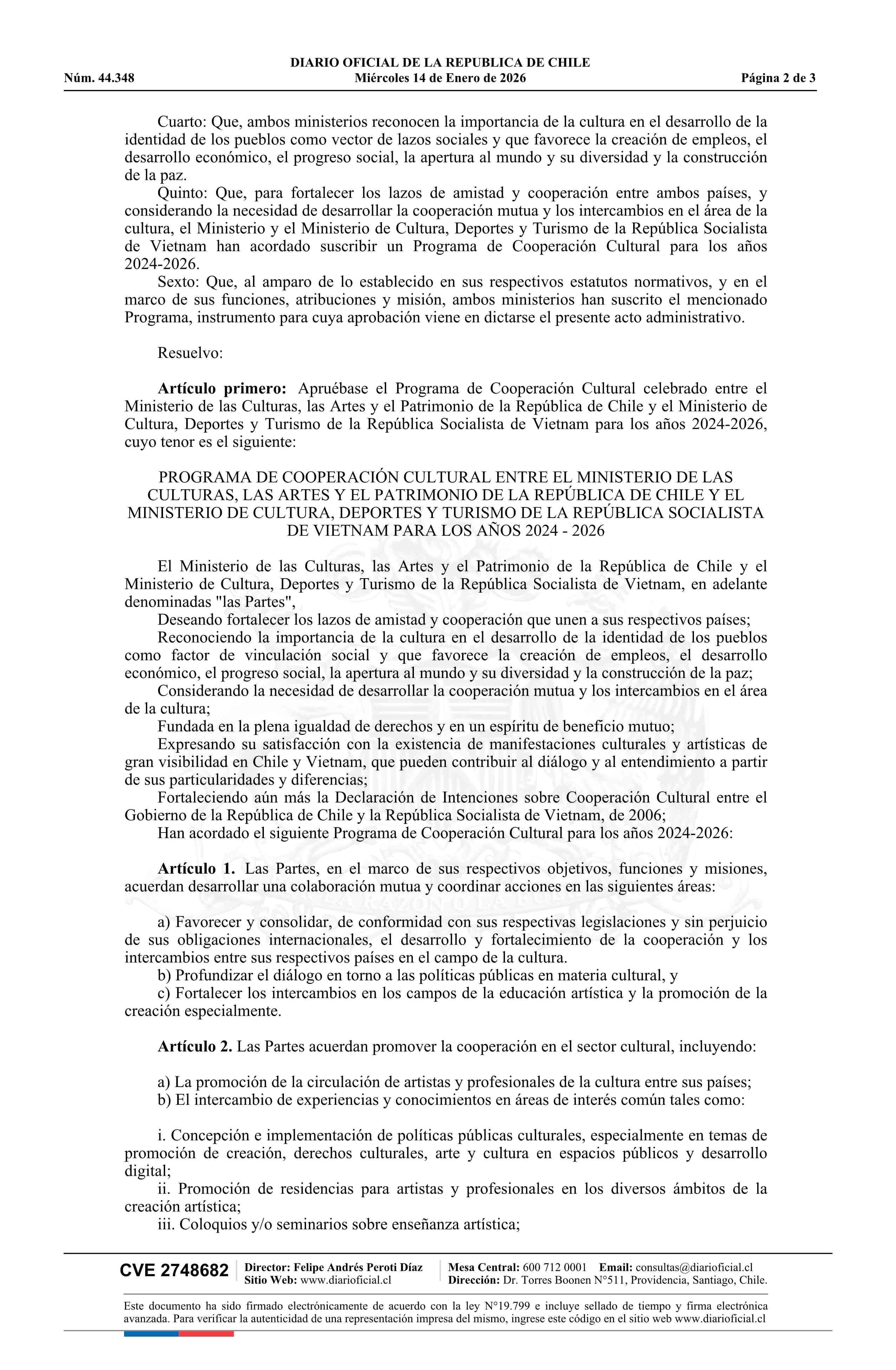 | Título: | Resolución exenta número 28, de 2025.- Aprueba Programa de Cooperación Cultural entre el Ministerio de las Culturas, las Artes y el Patrimonio de la República de Chile y el Ministerio de Cultura, Deportes y Turismo de la República Socialista de Vietnam para los Años 2024-2026 |