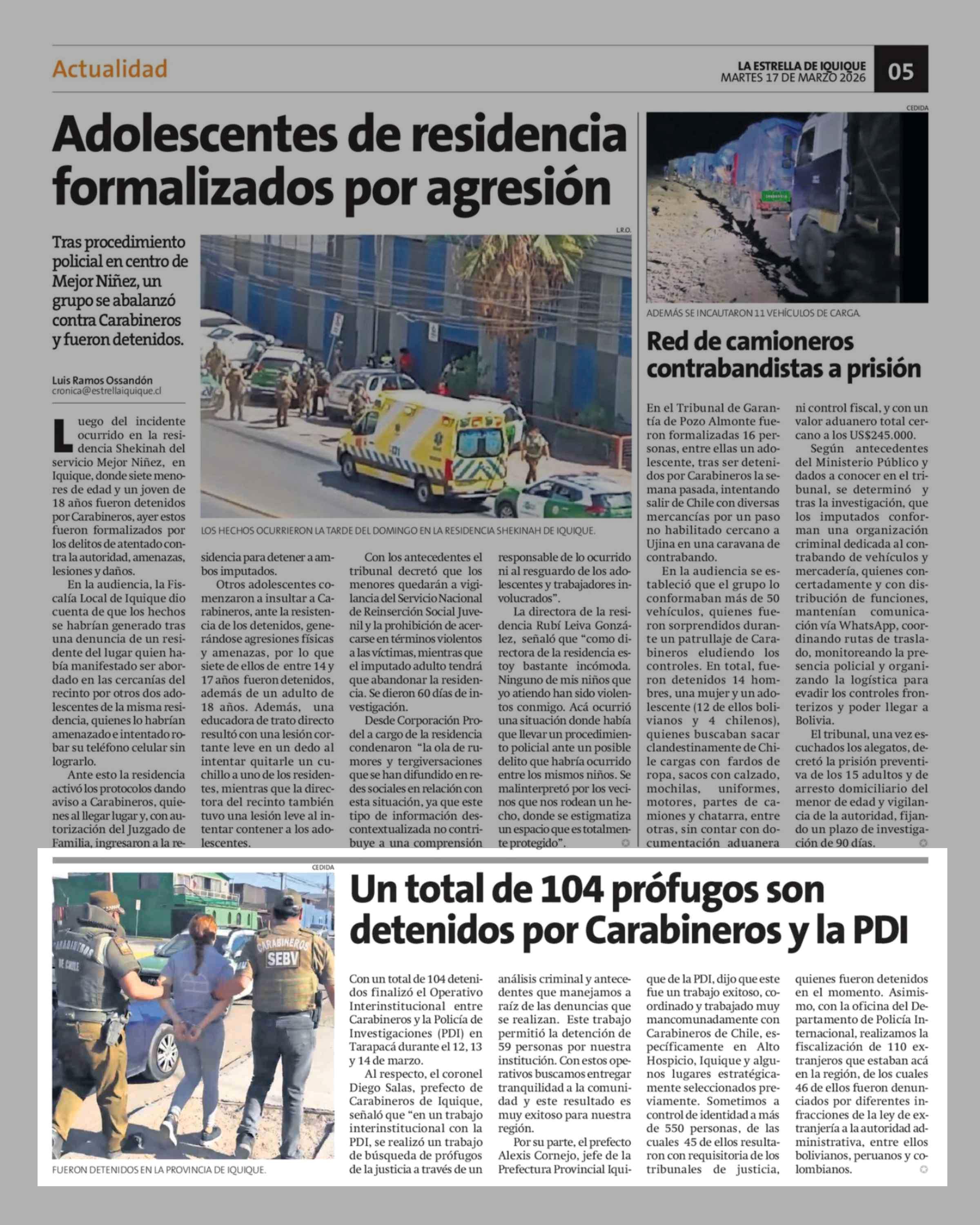 Un total de 104 prófugos son detenidos por Carabineros y la PDI 17-03-2026 La Estrella de Iquique |