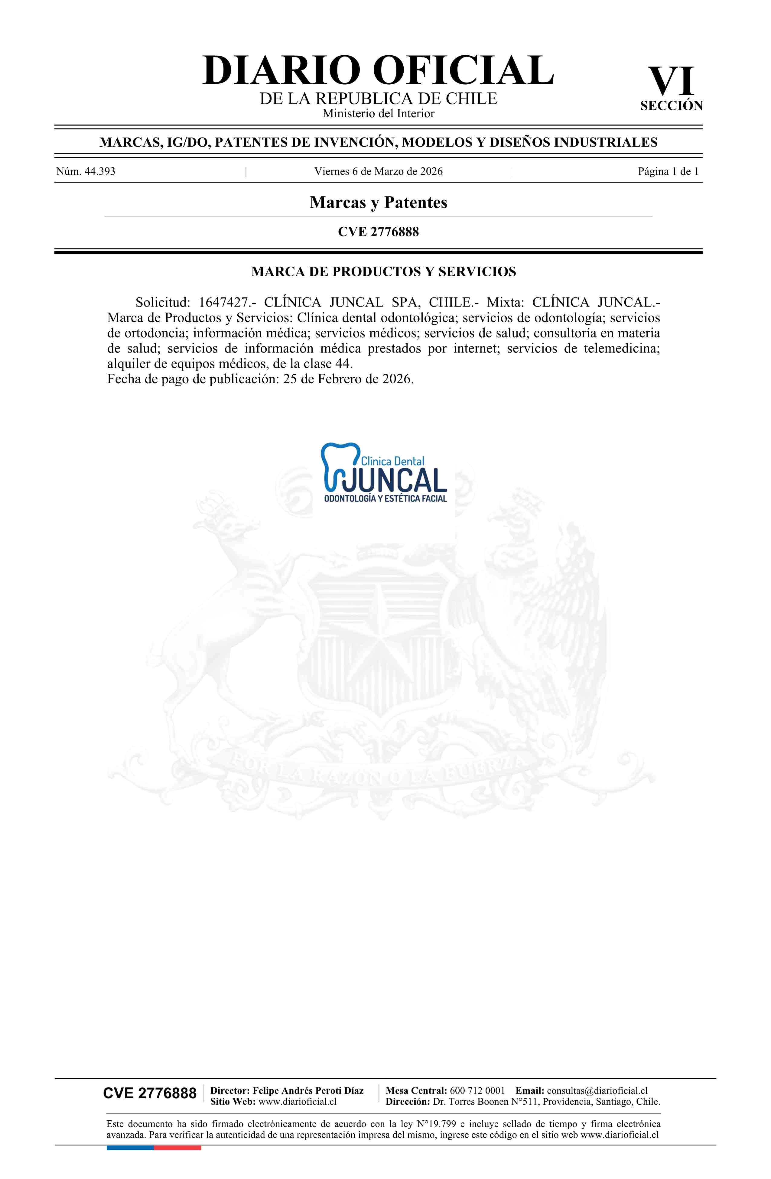 Solicitud número 1647427.- CLÍNICA JUNCAL 06-03-2026 Diario Oficial Edición Electrónica |