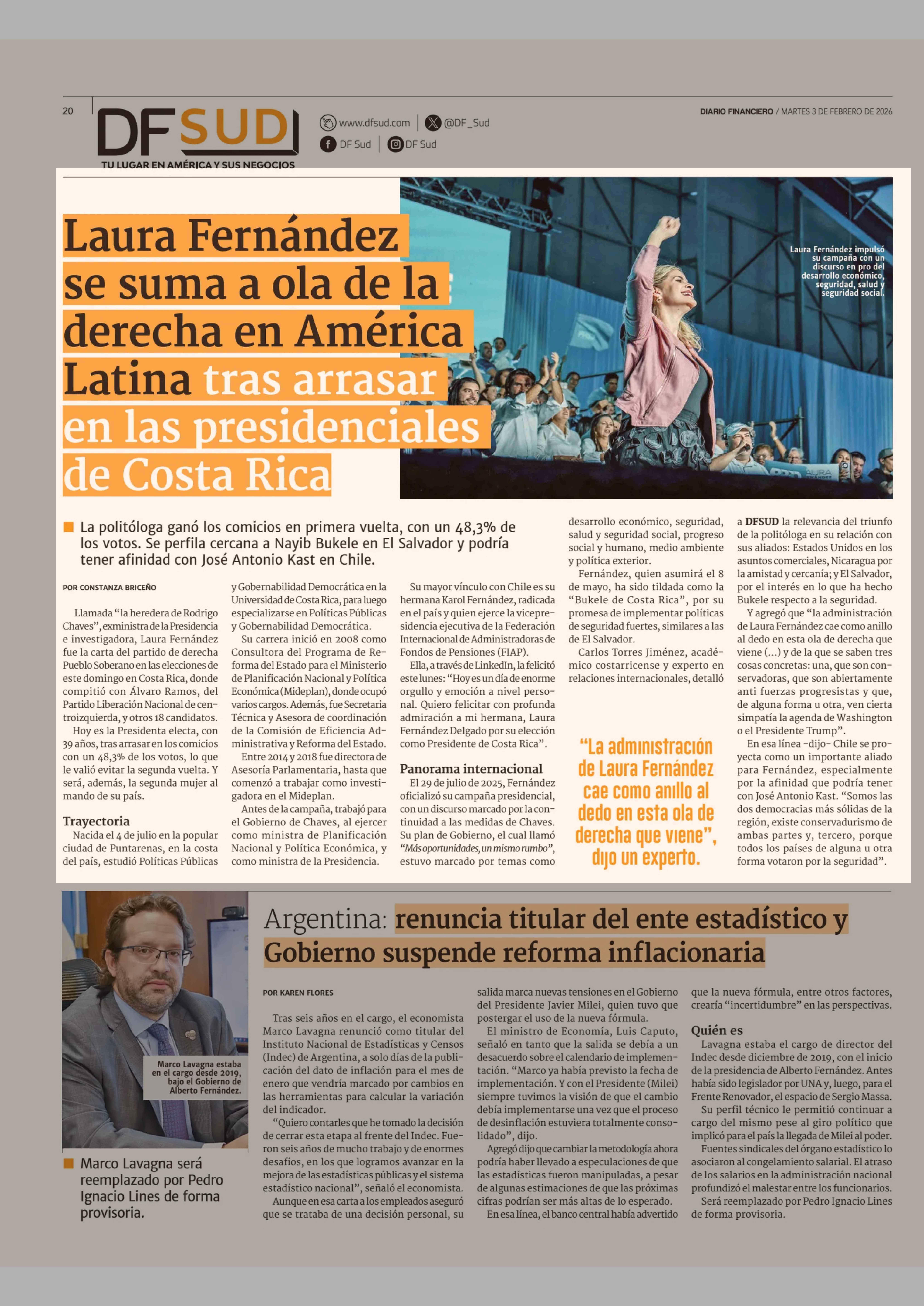 Laura Fernández se suma a ola de la derecha en América Latina tras arrasar en las presidenciales de Costa Rica 03-02-2026 Diario Financiero |