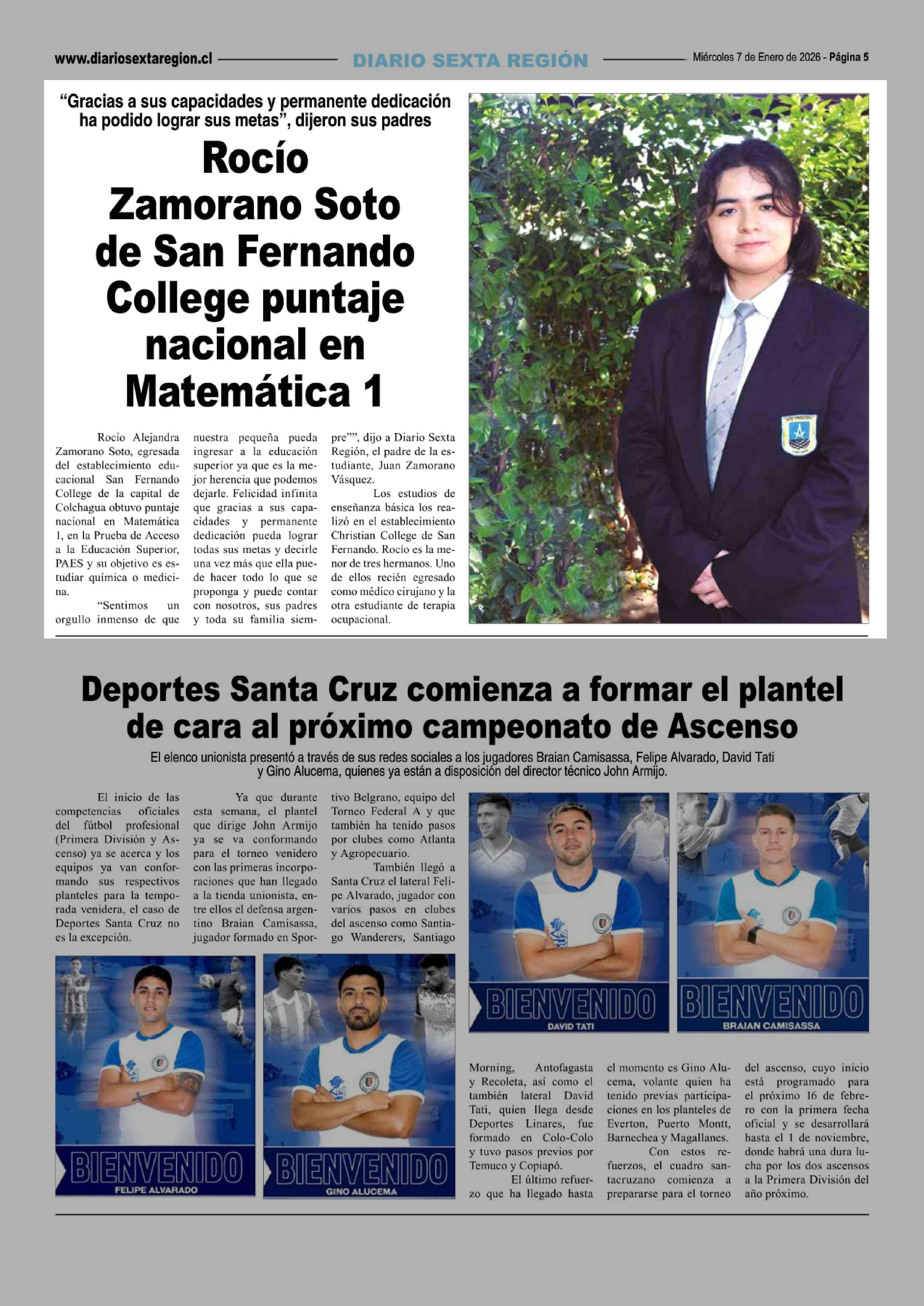 Rocío Zamorano Soto de San Fernando College puntaje nacional en Matemática 1 07-01-2026 Diario VI Región |