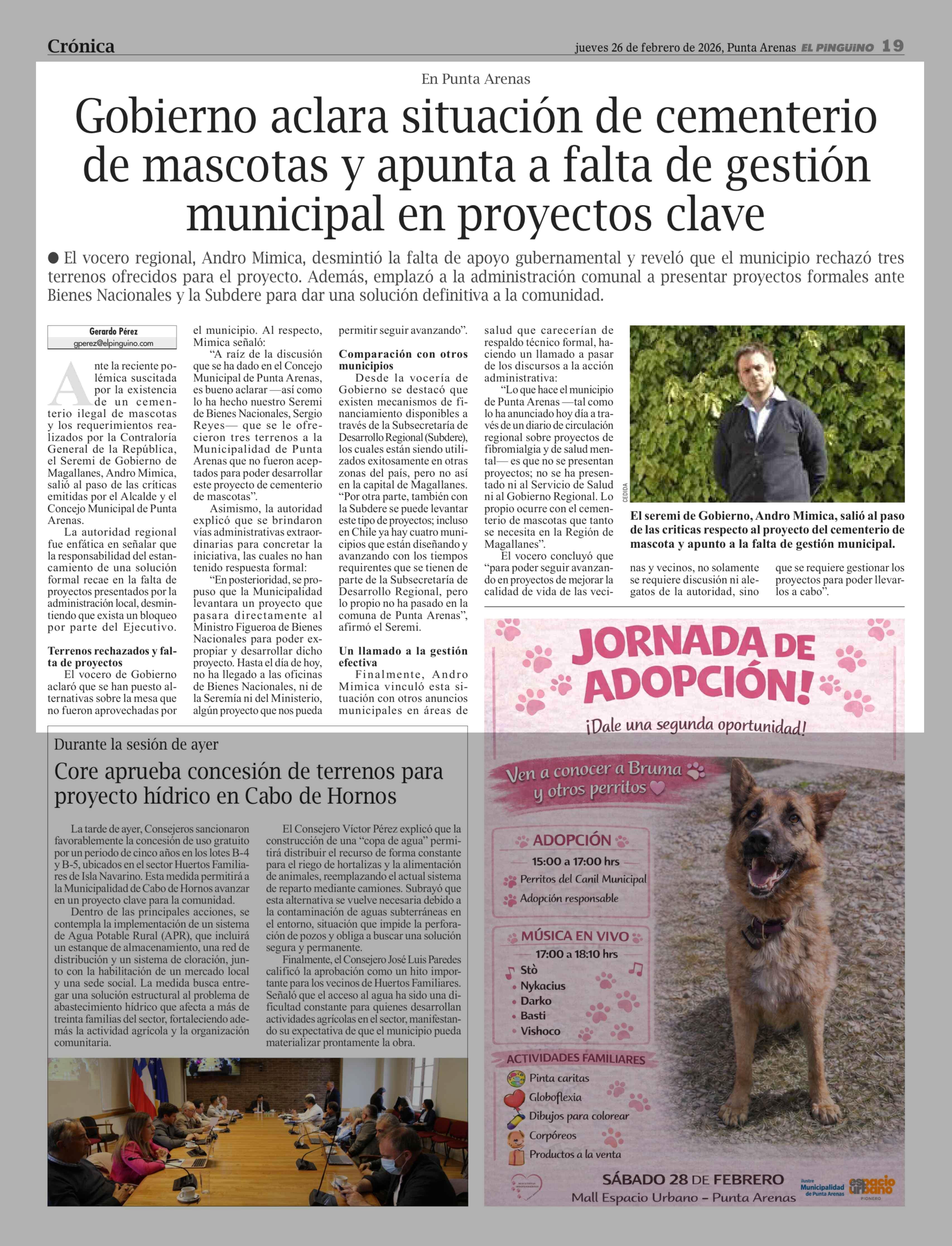 Gobierno aclara situación de cementerio de mascotas y apunta a falta de gestión municipal en proyectos clave 26-02-2026 El Pingüino |