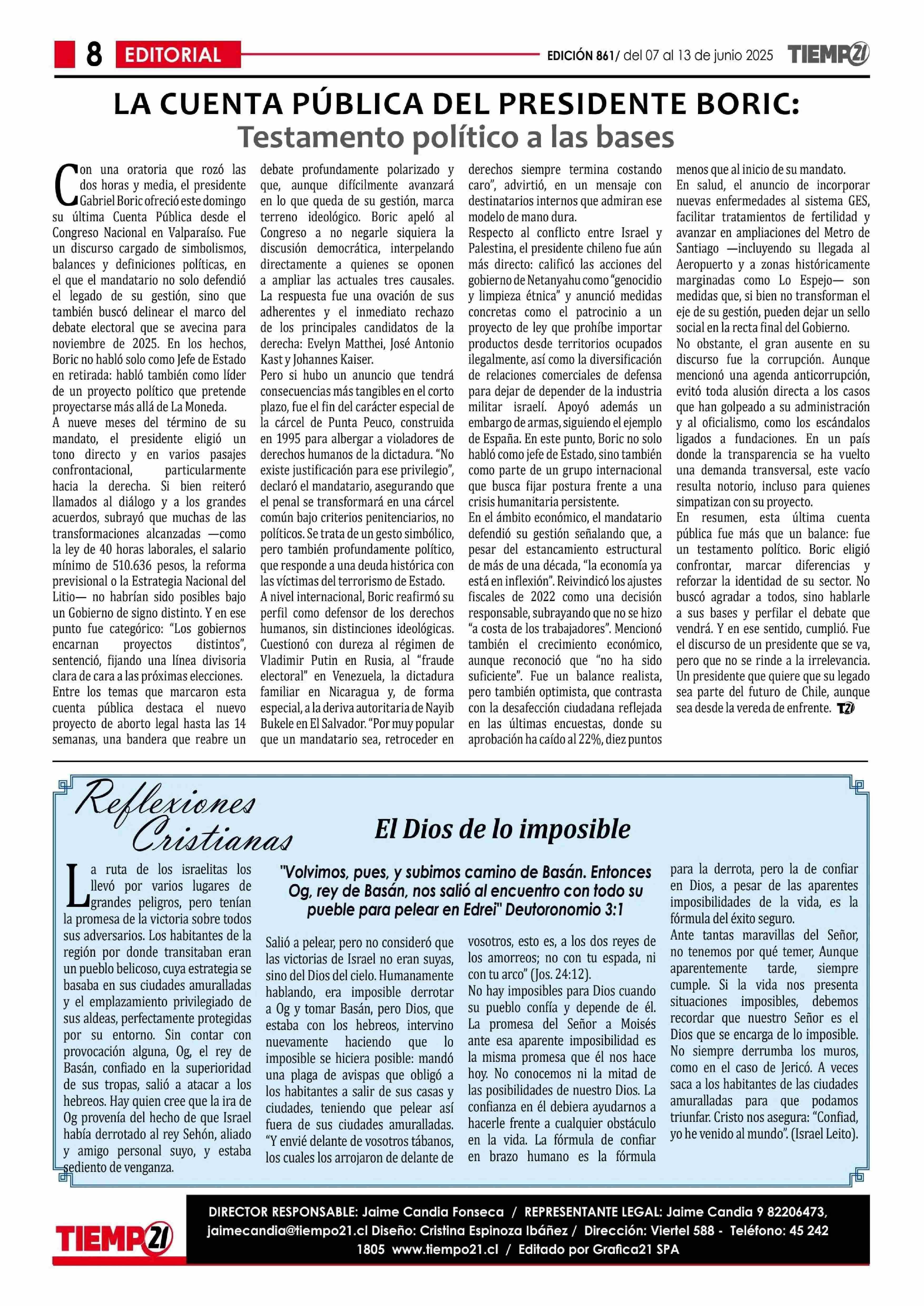 EDITORIAL: LA CUENTA PÚBLICA DEL PRESIDENTE BORIC,Testamento político a las bases 07-06-2025 Tiempo 21 |