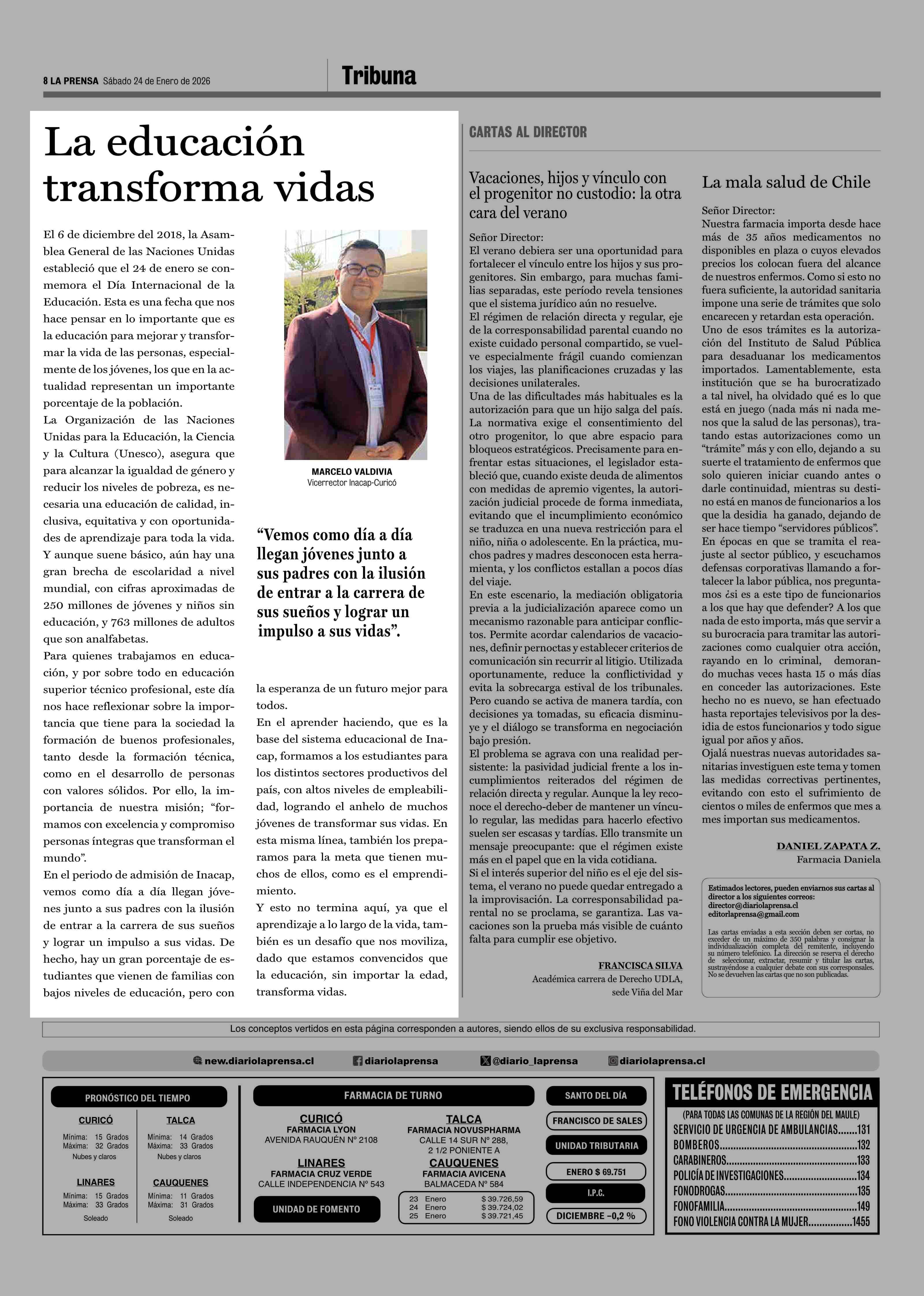 Columnas de Opinión: La educación transforma vidas 24-01-2026 La Prensa de Curicó |